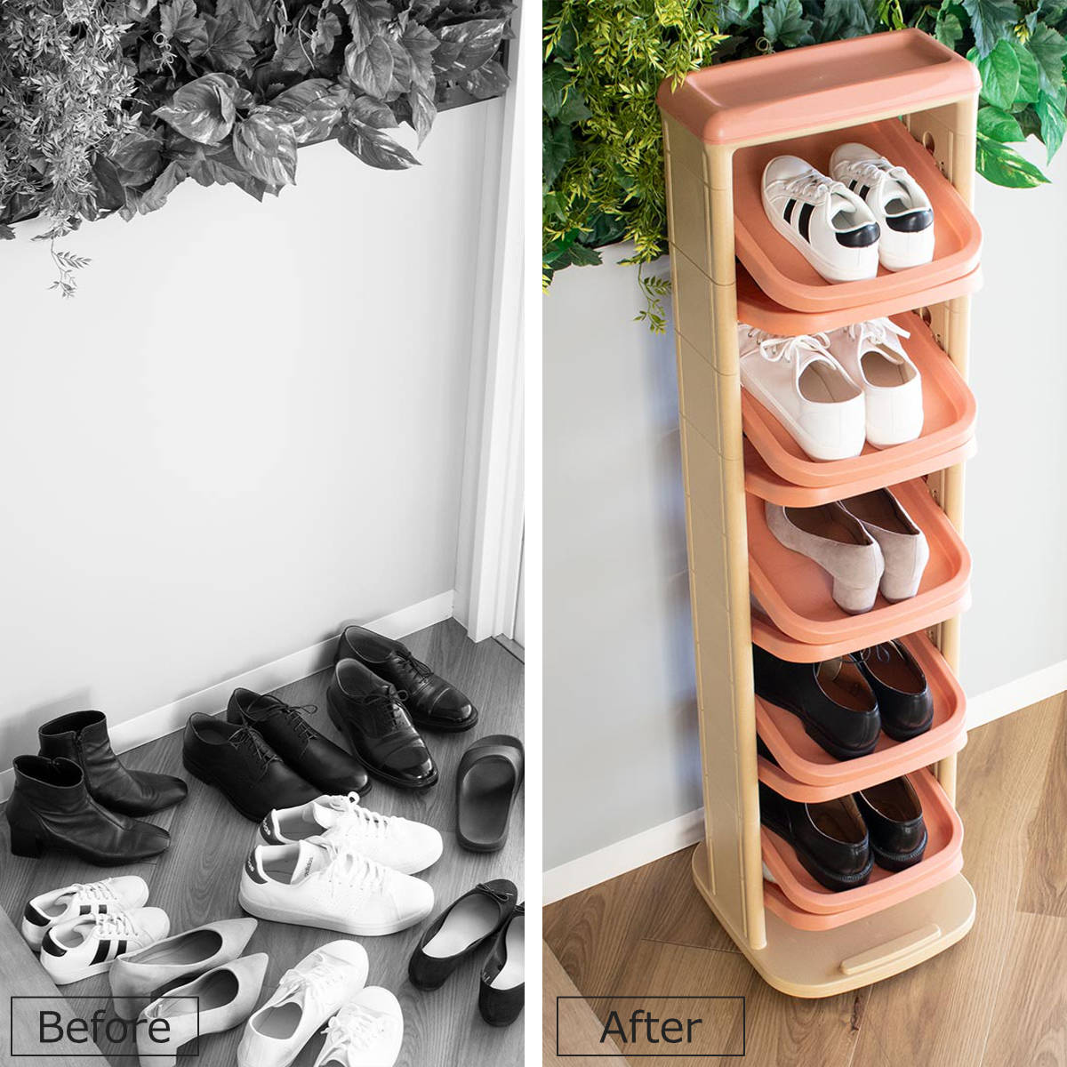 台座には360度回転するベアリングを採用しており、前後どちらからでも出し入れしやすい設計です。外靴とスリッパを分けて収納するなど、使い方の幅が広がります。