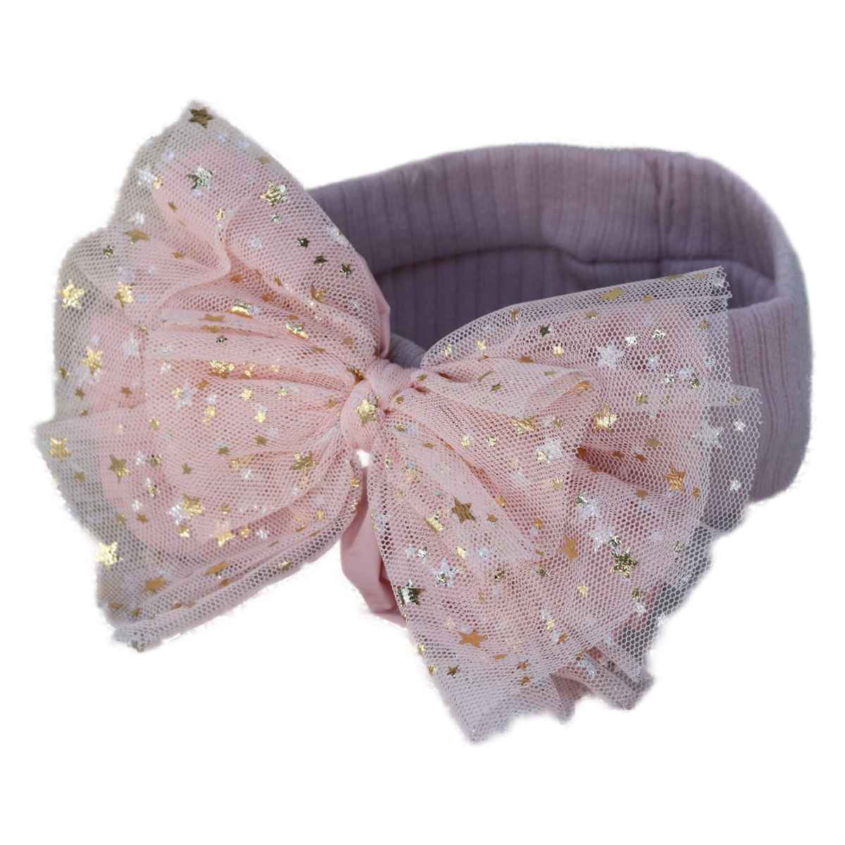 キラキラ光る星柄のラメが入ったチュール生地を使用し、大きなリボンのヘアバンドに仕上げました。赤ちゃんのお誕生日や記念撮影などの特別な日の装いを華やかに彩ります。