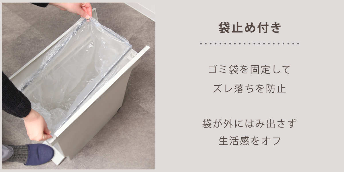袋止めにスリットが付いているから、複数のゴミ袋をかけることもできます。かさばりがちなペットボトルや食品トレーも、1つのゴミ箱にまとめてコンパクトに。省スペースな分別が叶います。