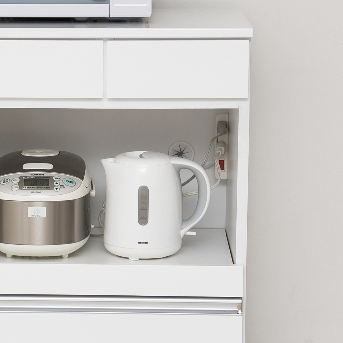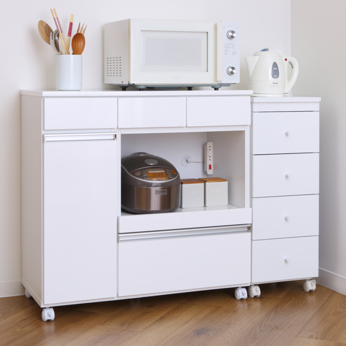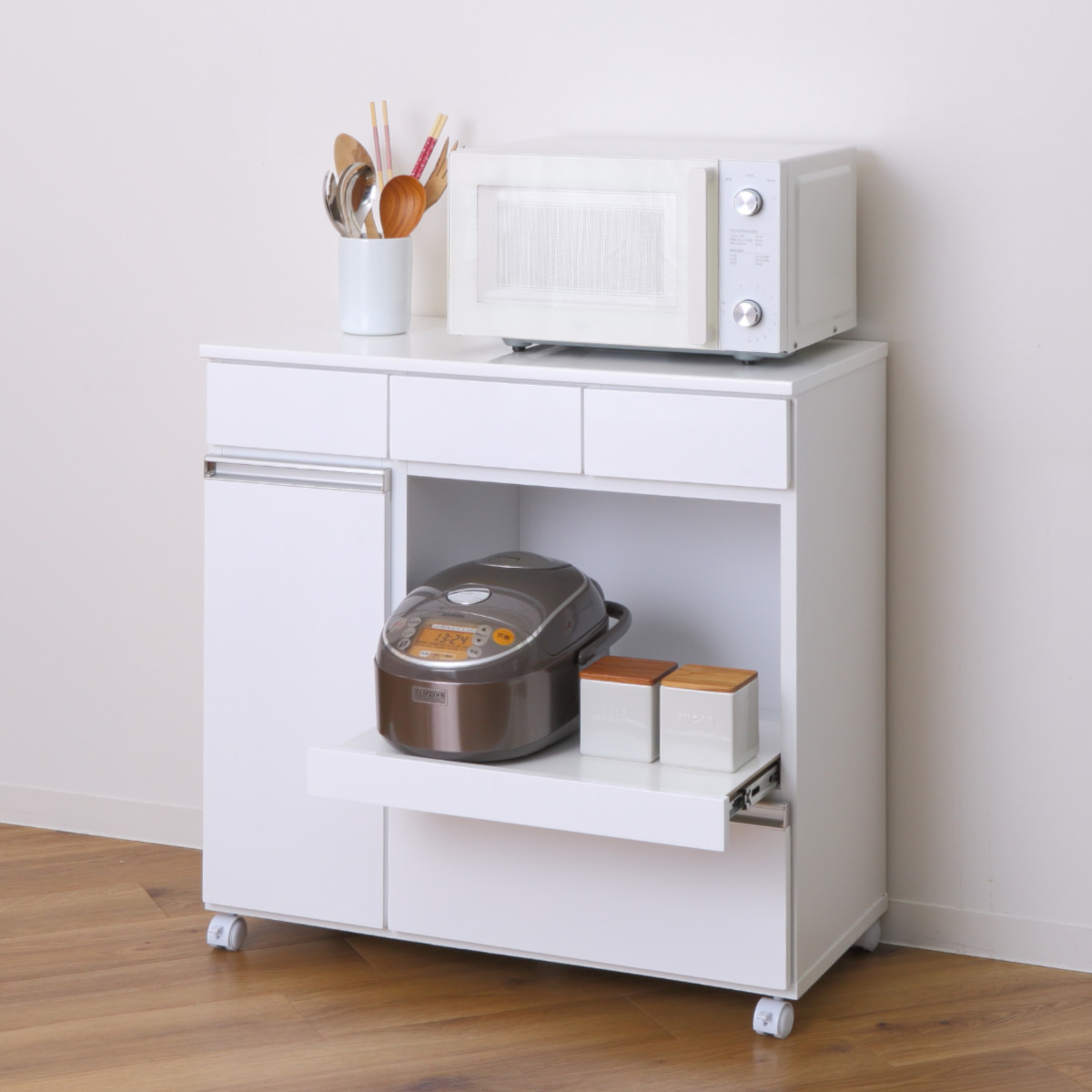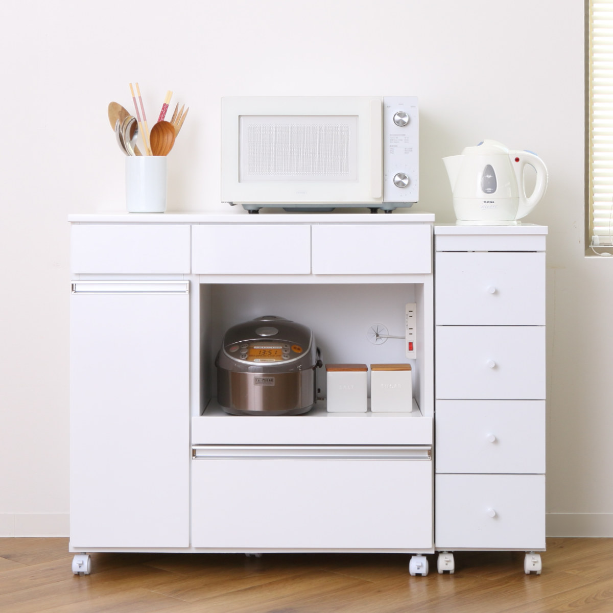 清潔感のあるホワイトカラーでシンプルなデザインのレンジ台です。小物の整理に便利な引出しや食器を入れておける扉収納など、たっぷりの収納スペースが魅力。家電やキッチン用品をひとまとめにしておけるので、スペースの限られたキッチンでもすっきりと片付きます。