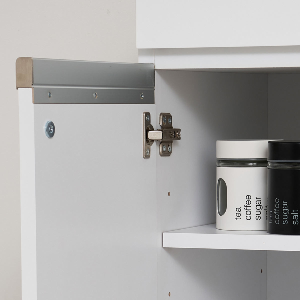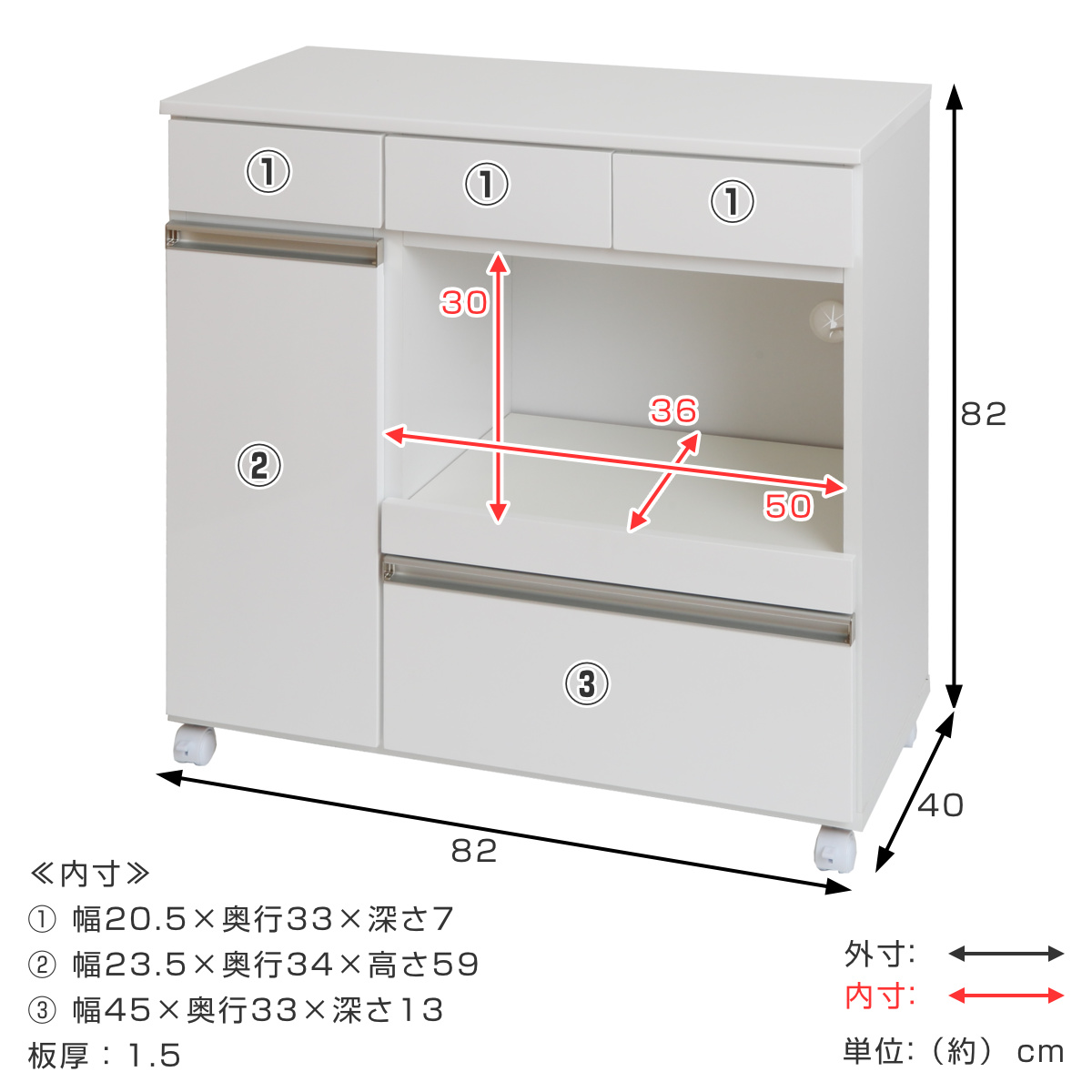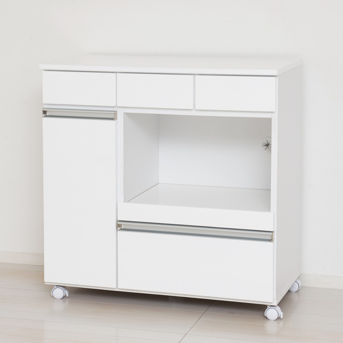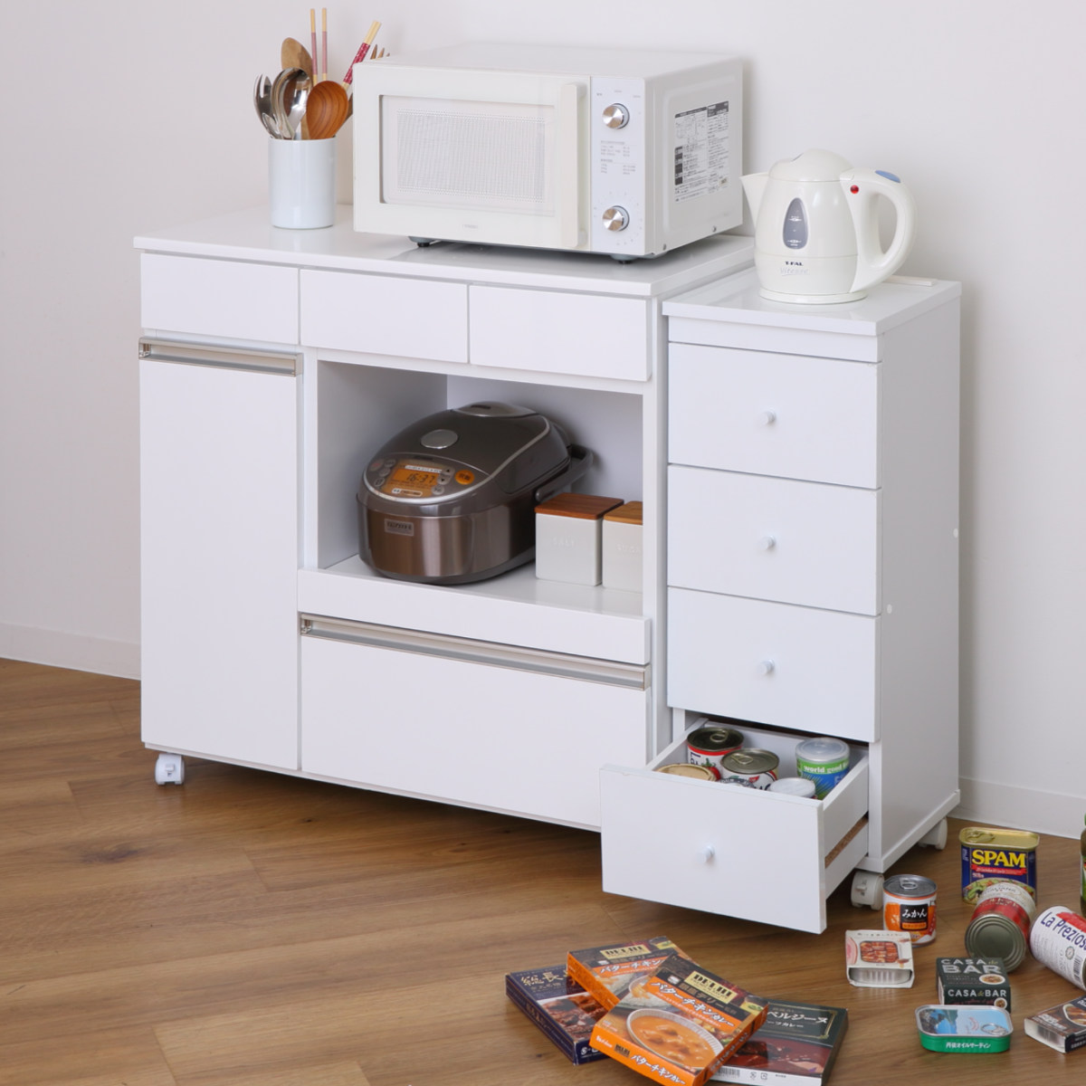清潔感のあるホワイトカラーでシンプルなデザインのレンジ台です。小物の整理に便利な引出しや食器を入れておける扉収納など、たっぷりの収納スペースが魅力。家電やキッチン用品をひとまとめにしておけるので、スペースの限られたキッチンでもすっきりと片付きます。