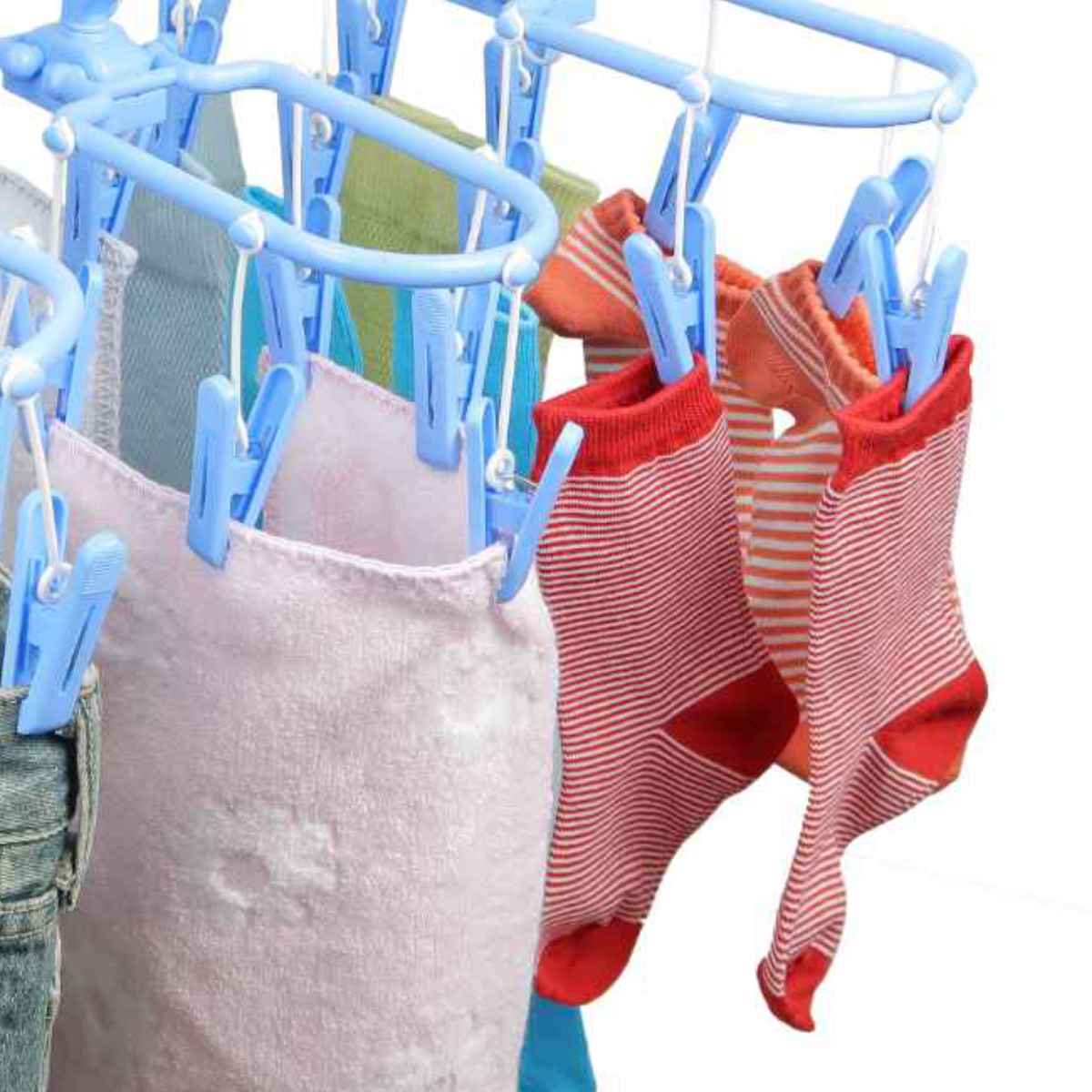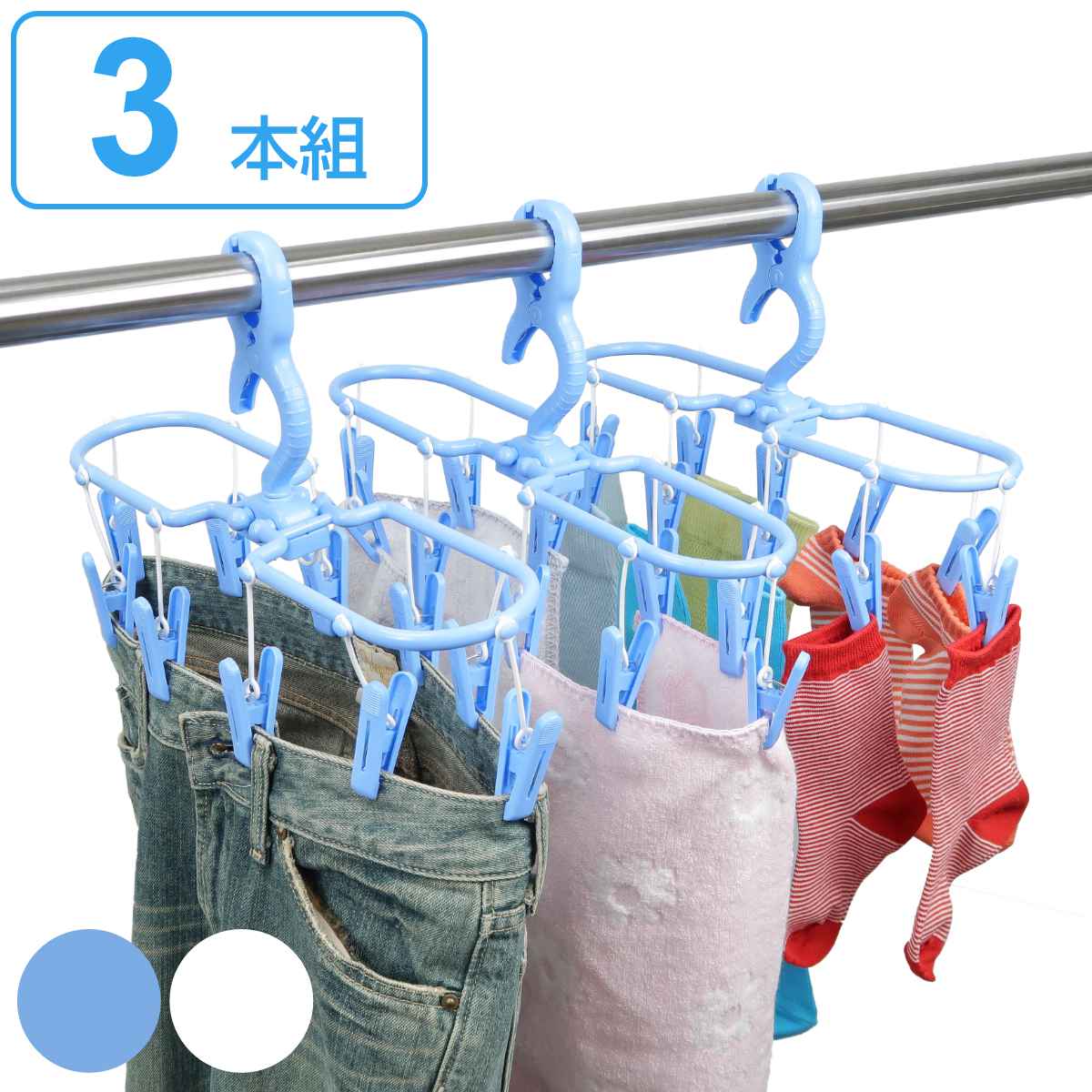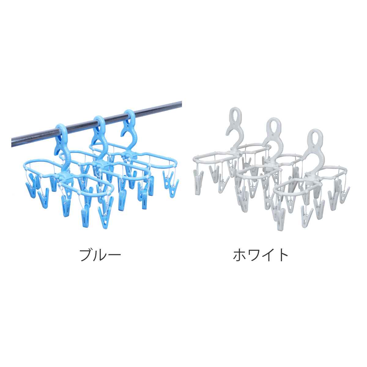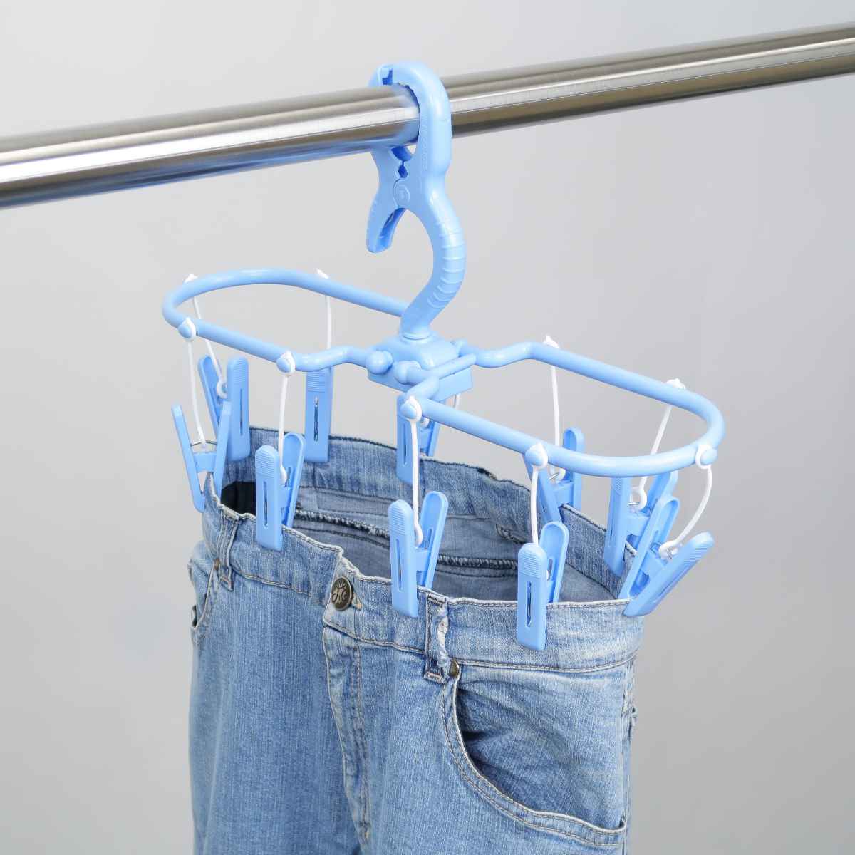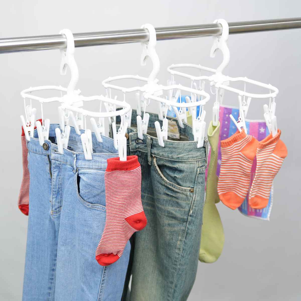 厚手のボトムスや小物を干す時に便利なピンチ付きハンガーです。1つのハンガーで10個のピンチが付いています。乾きにくいデニムやパンツなどのウエスト部分を広げて干せるので早く乾かせます。