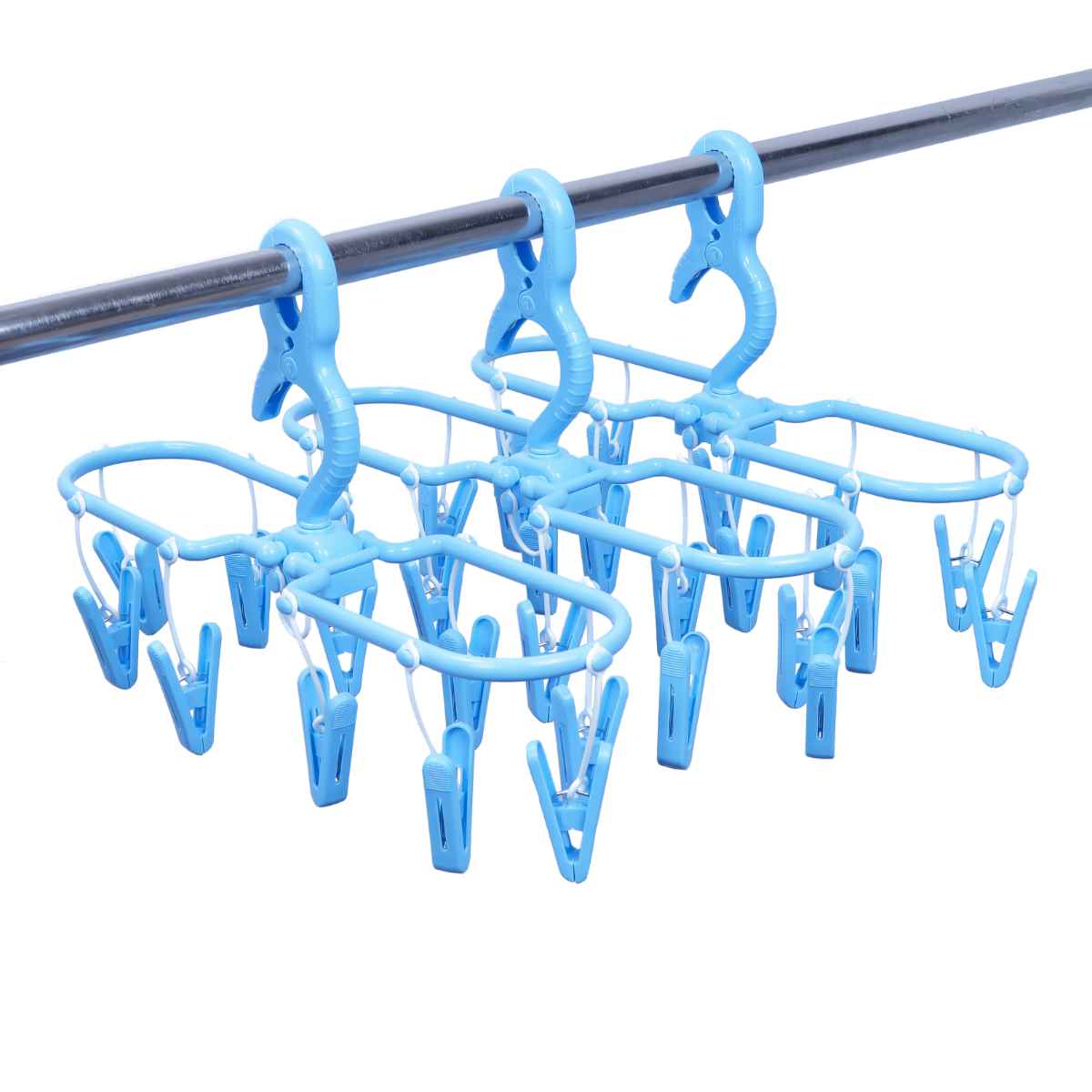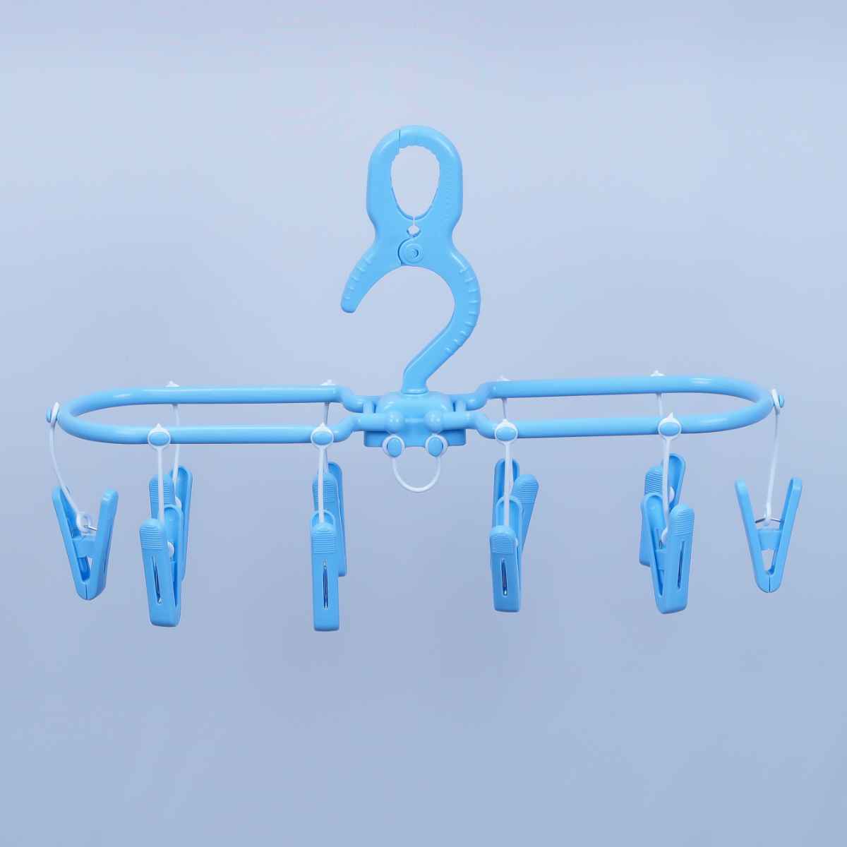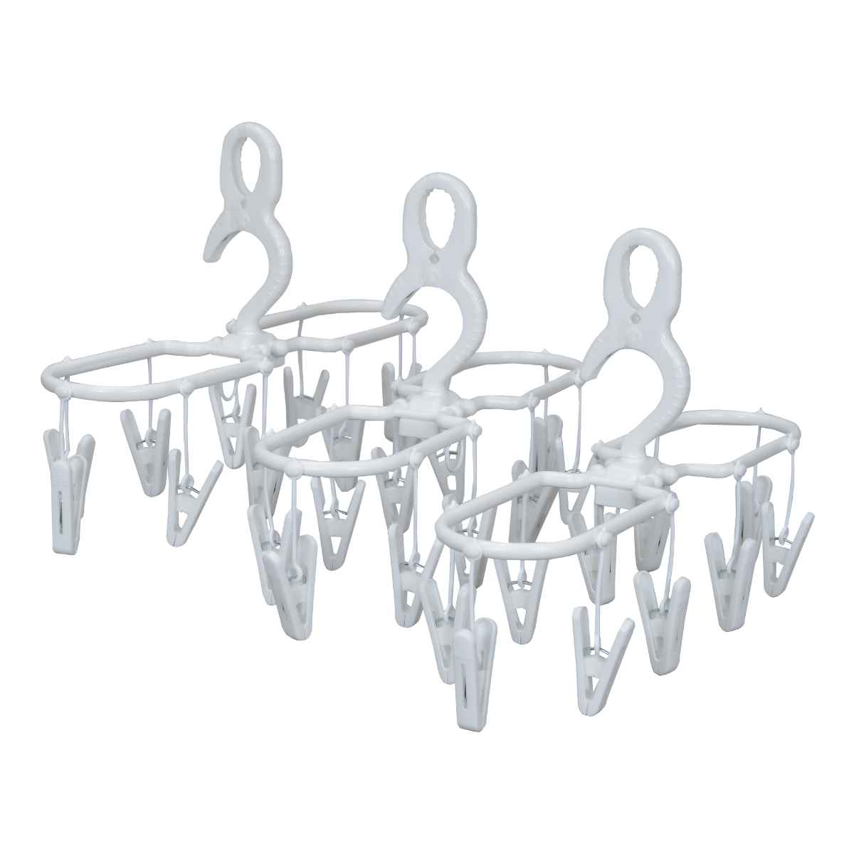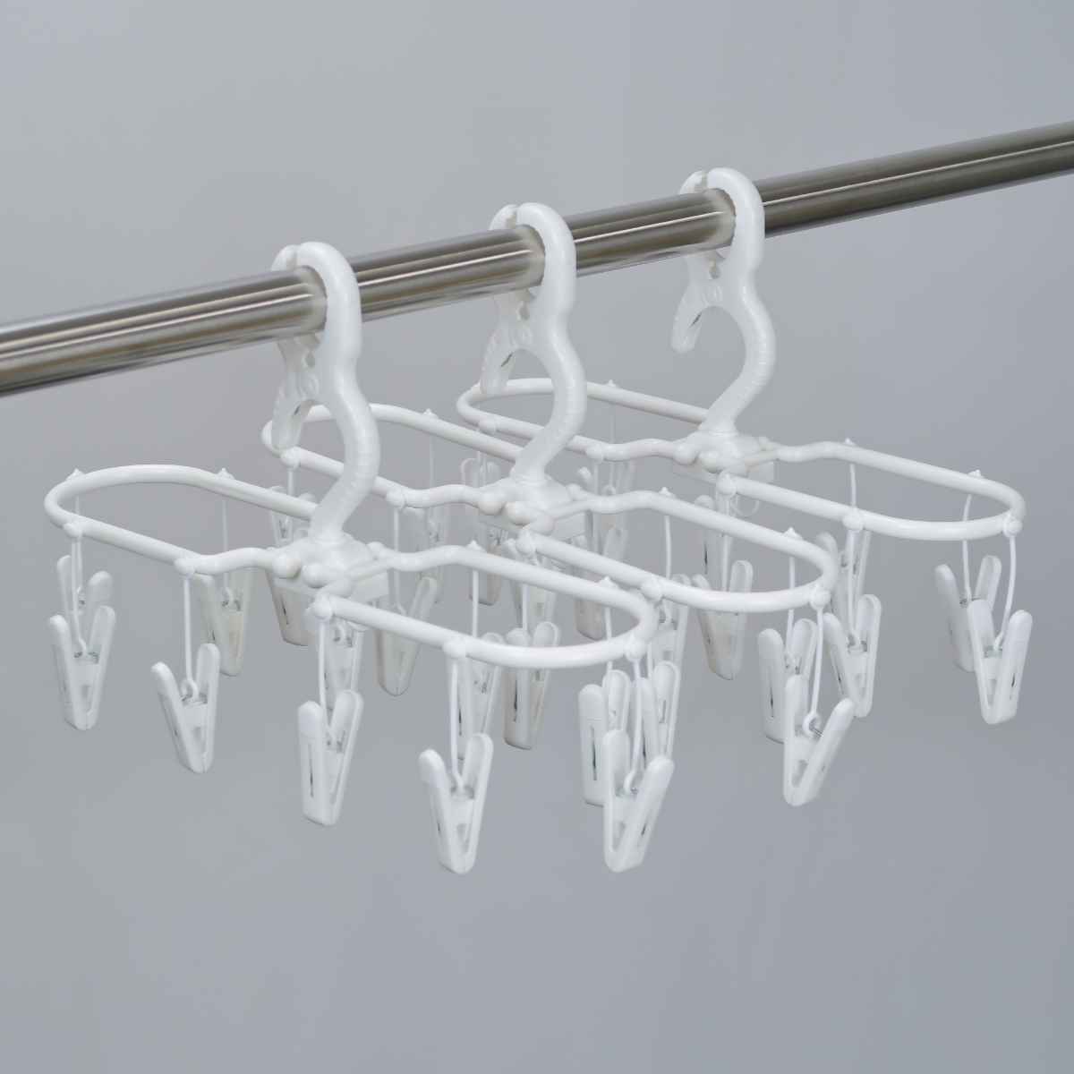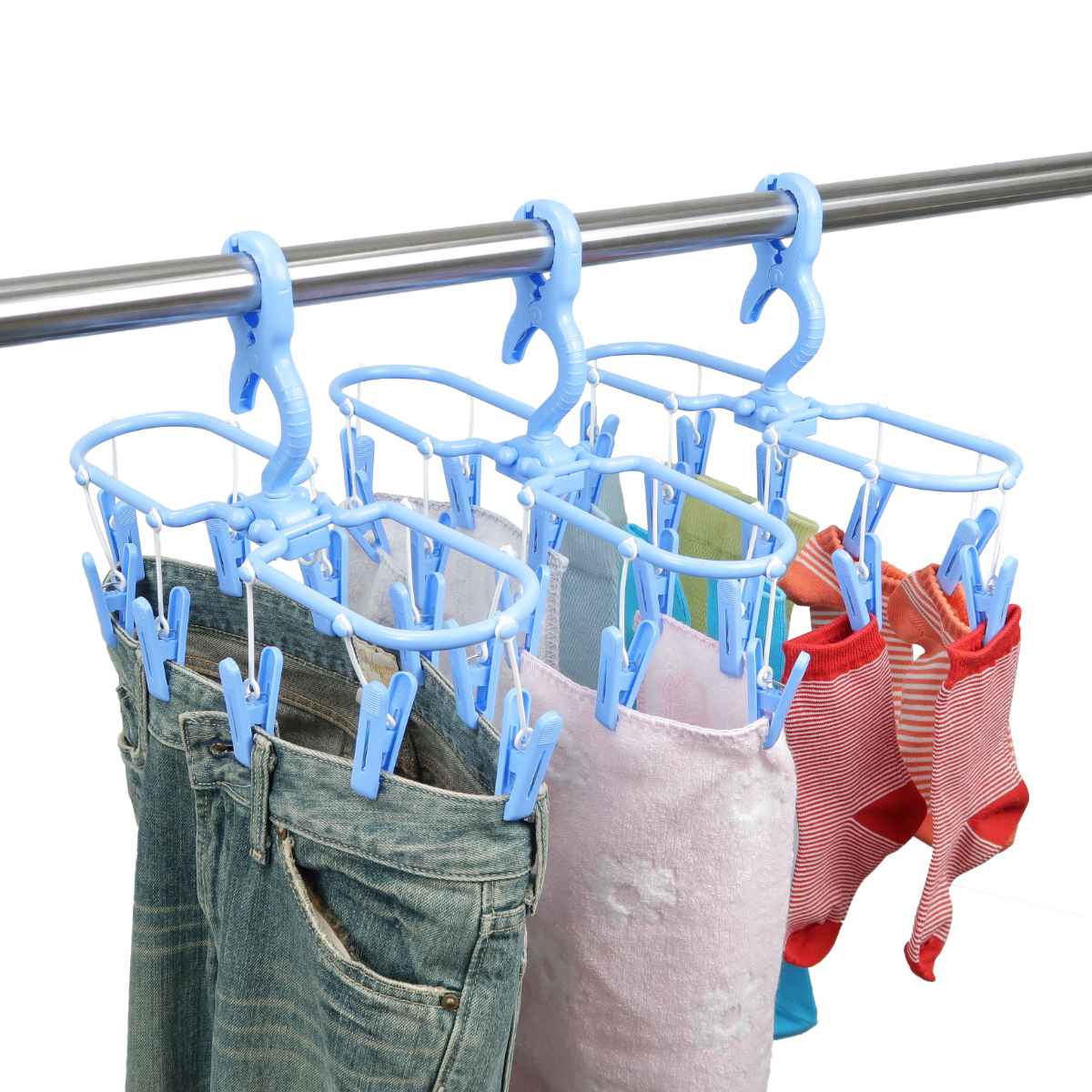 厚手のボトムスや小物を干す時に便利なピンチ付きハンガーです。1つのハンガーで10個のピンチが付いています。乾きにくいデニムやパンツなどのウエスト部分を広げて干せるので早く乾かせます。