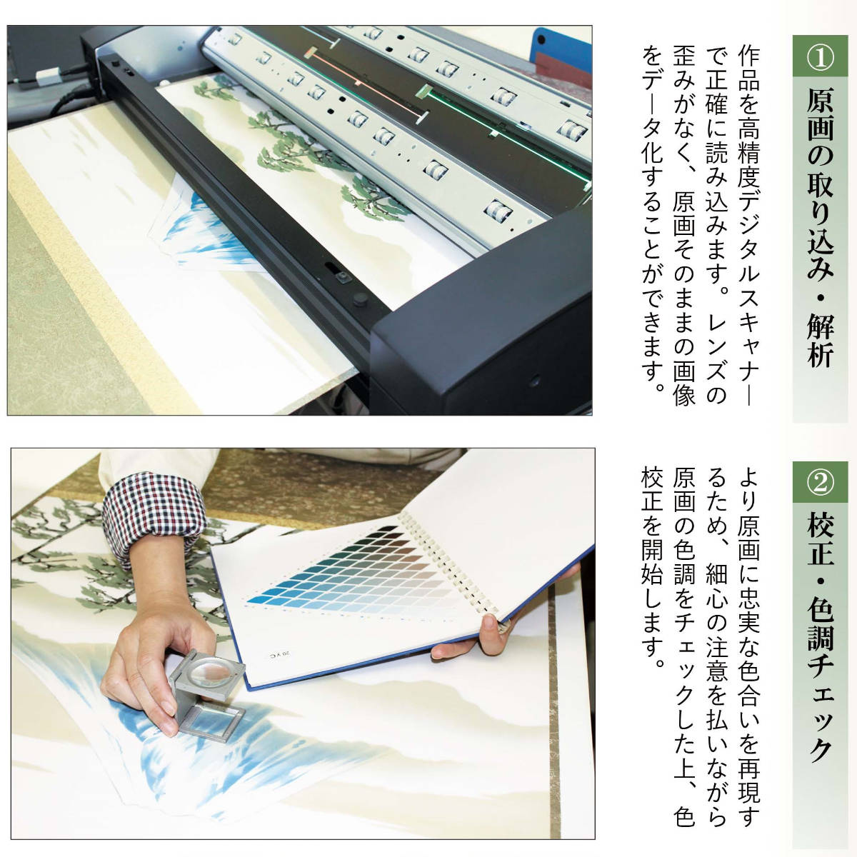 原画を高精度スキャナーで正確に取り込み、原画を忠実に再現するよう校正・色調チェックをします。細部まで徹底検品してから、お客様のもとへお届けしています。