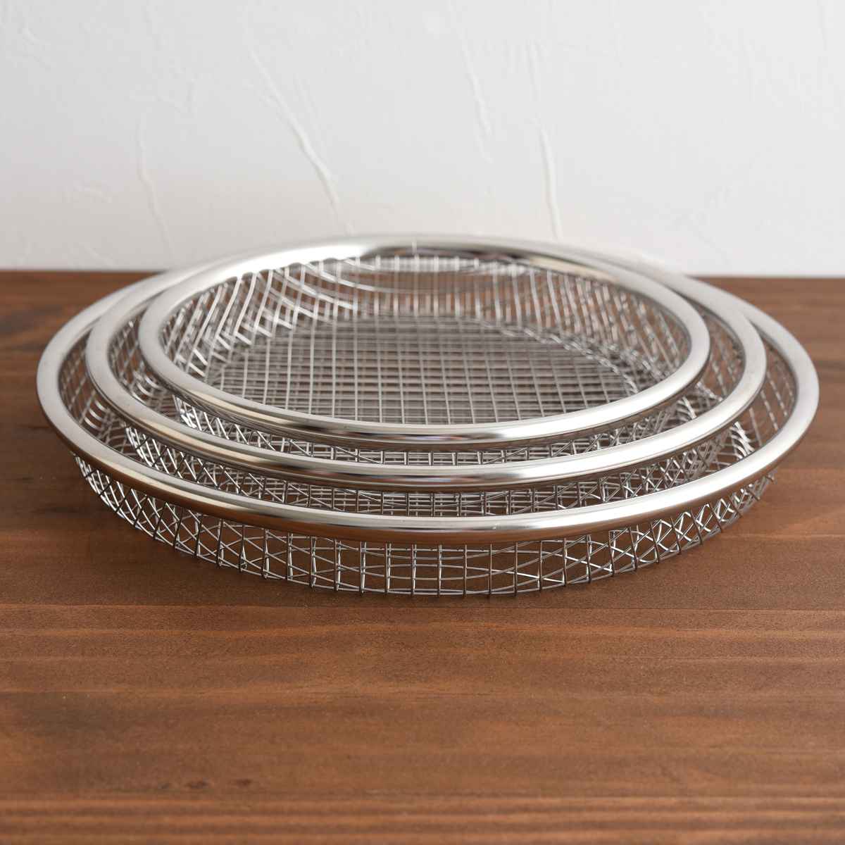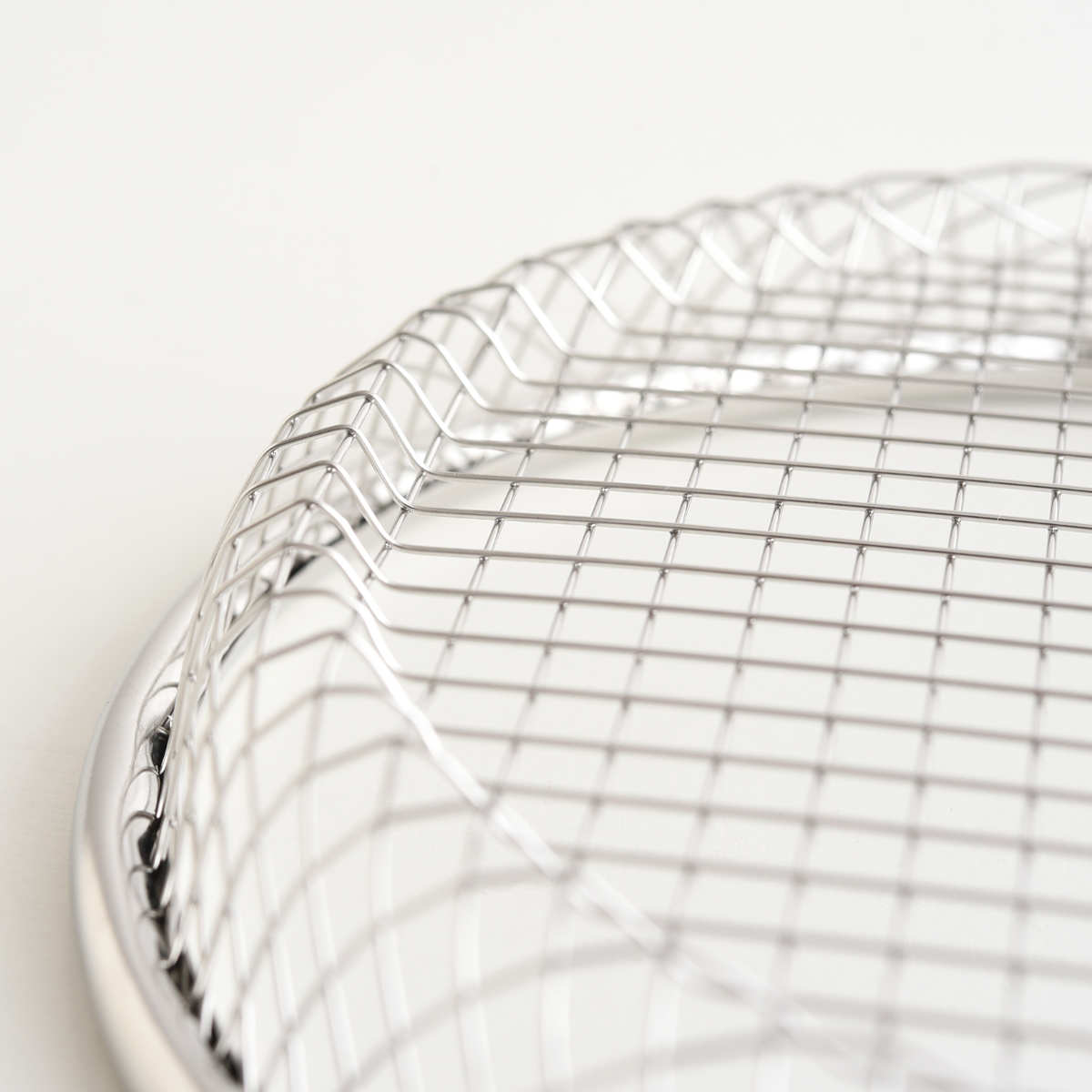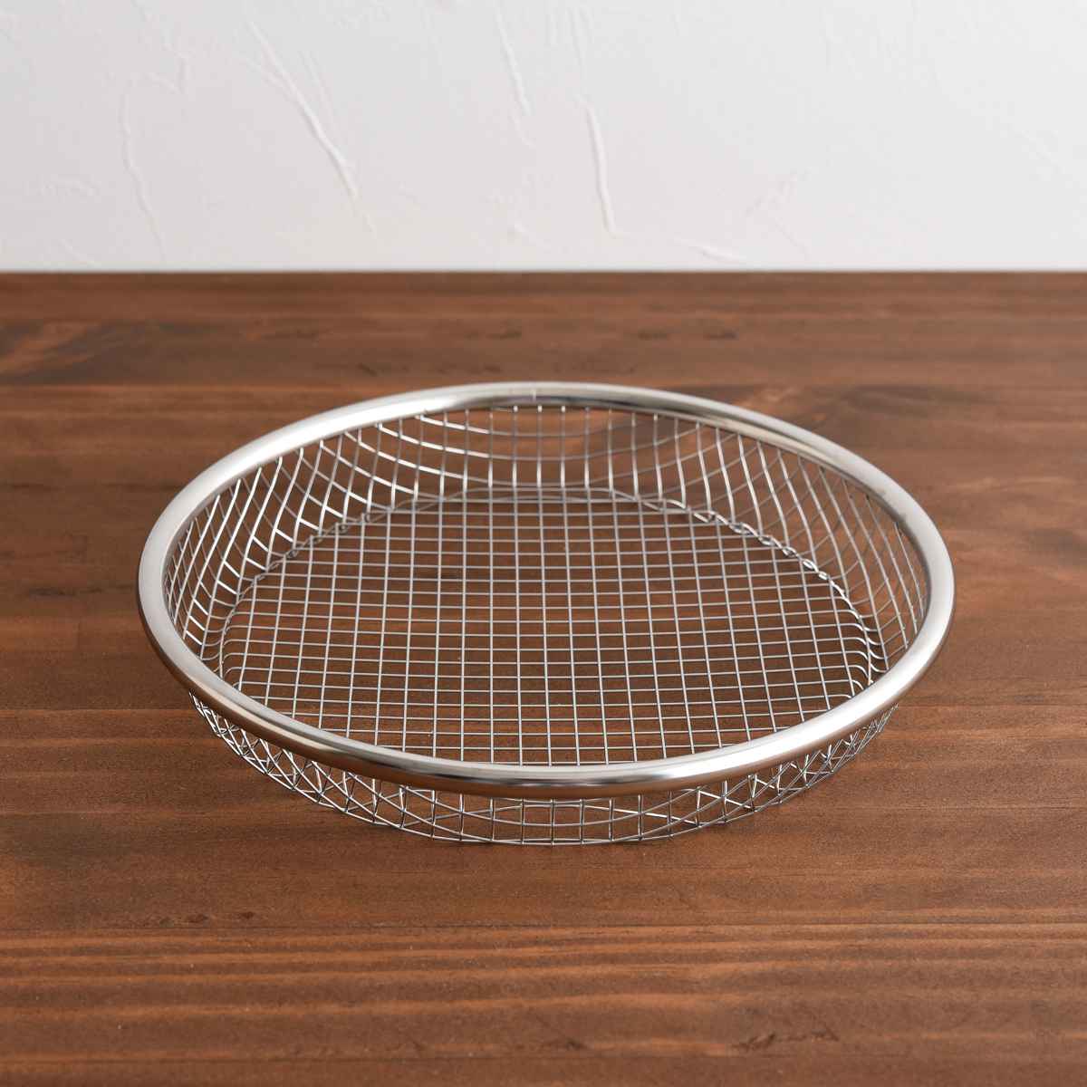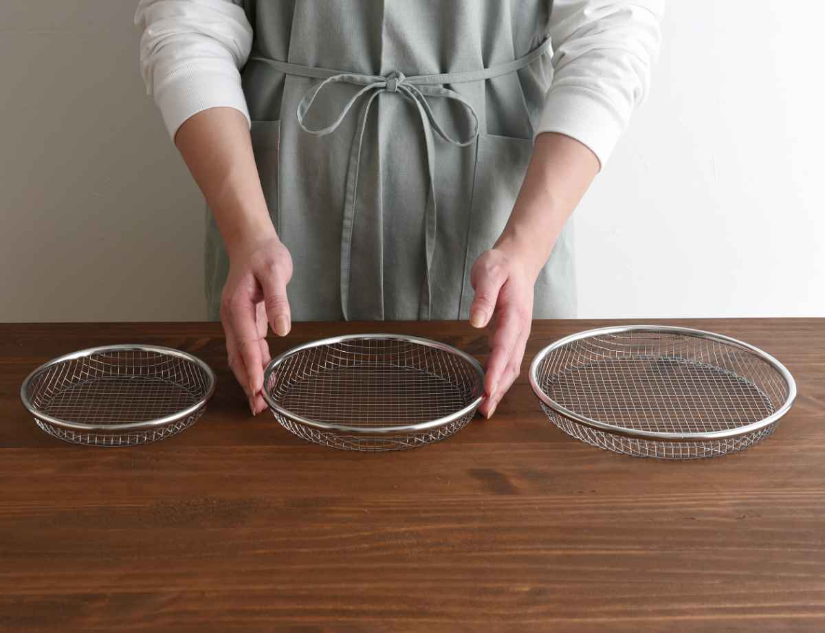新潟県燕三条地域で生産された、ステンレス製の「お皿のための」ザルです。そのまま食卓に出せるように高級感のある仕上げにこだわりました。ご自宅にあるお皿と組み合わせて使うことで、ザルとお皿の間に隙間ができ、熱や湿気が抜けて美味しさと食感をキープします。