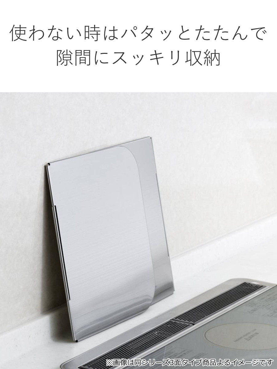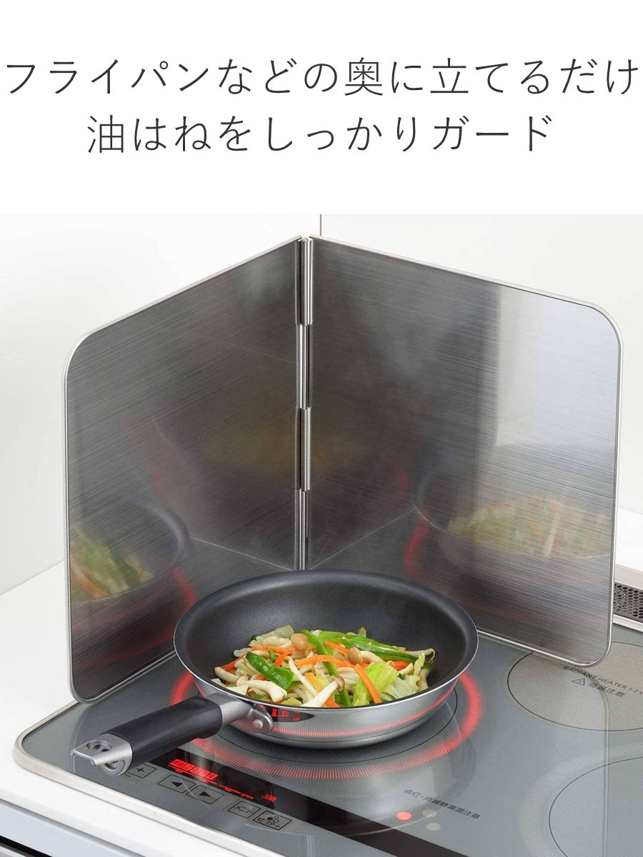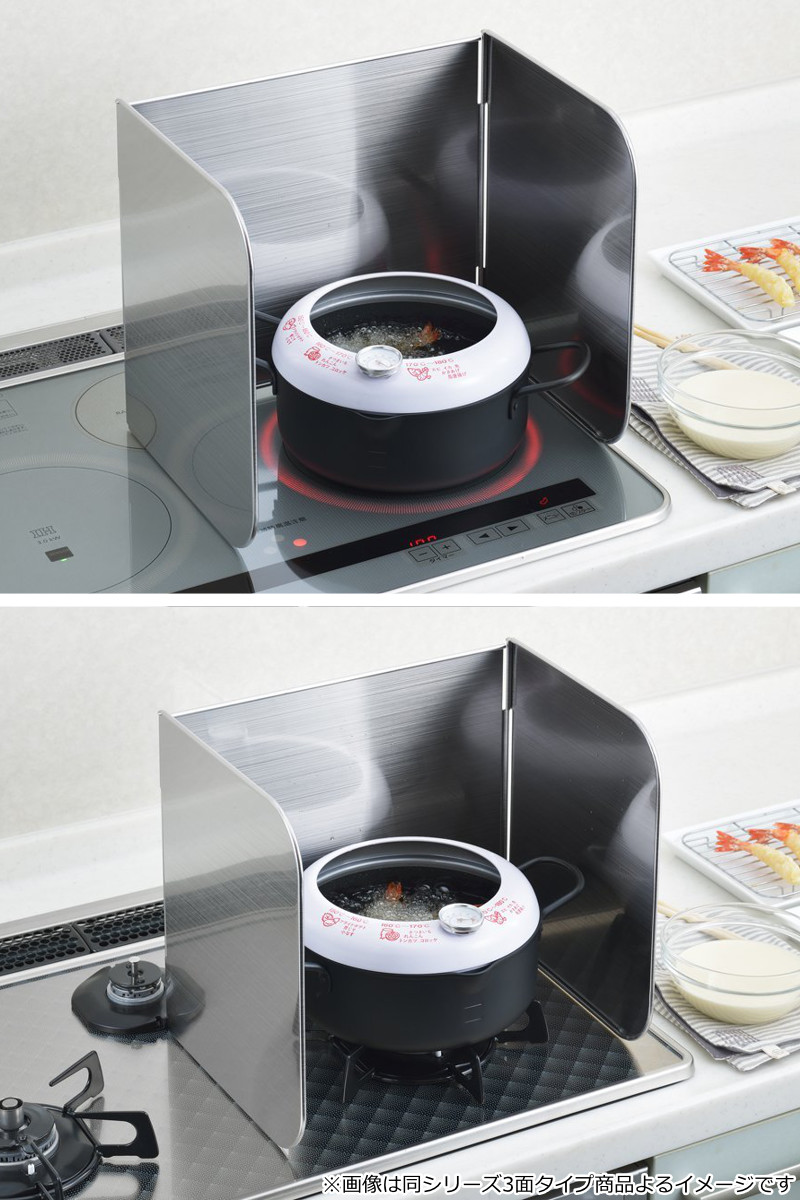 フライパンや鍋のそばに立てるだけの簡単設置で手軽に使えます。2面タイプなので、コンロやIH、鍋などのサイズを気にせずにお使いいただけます。
