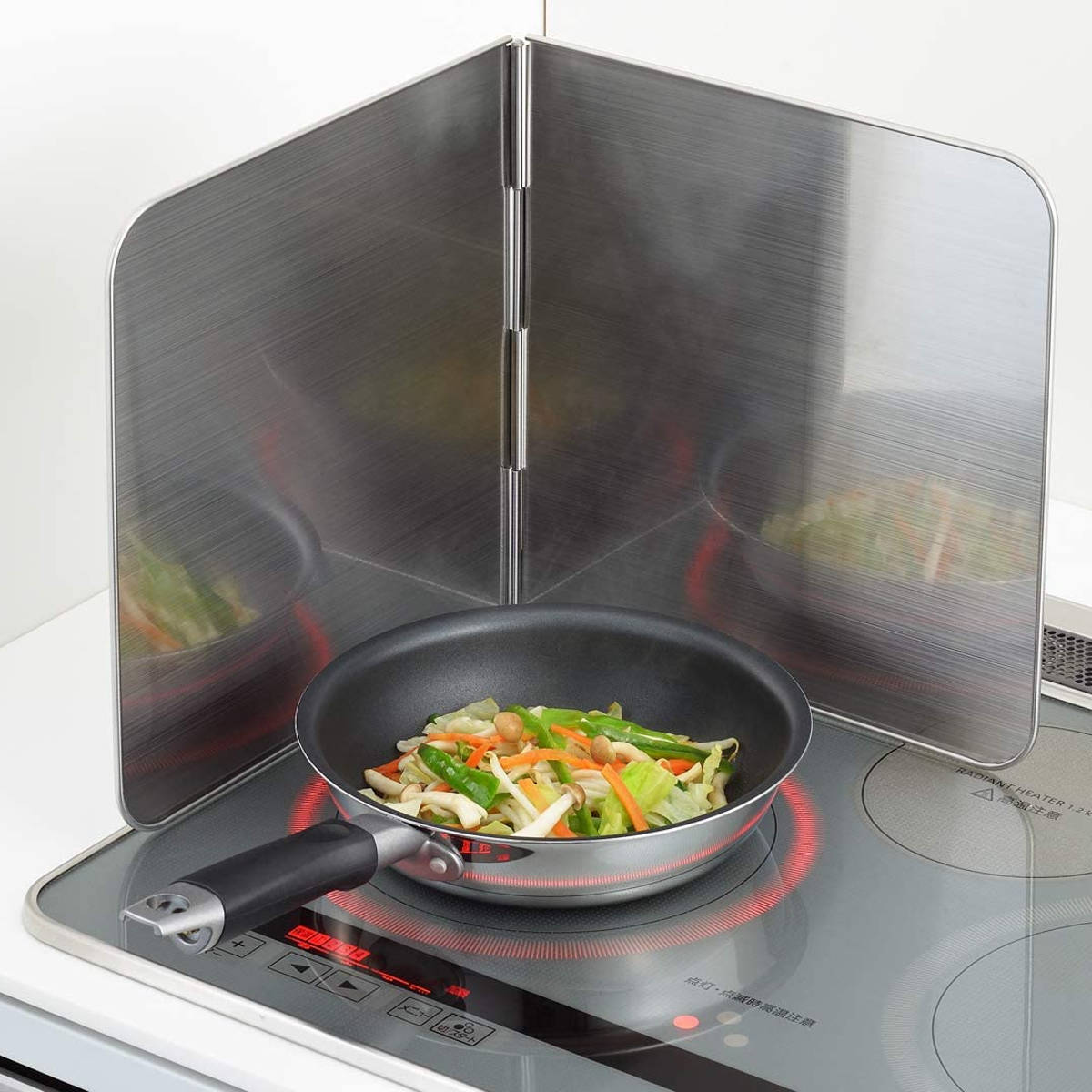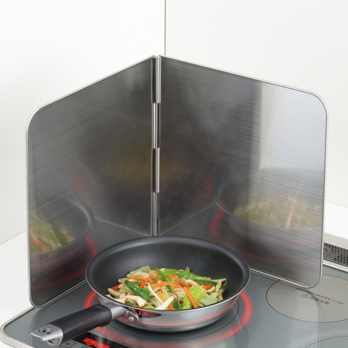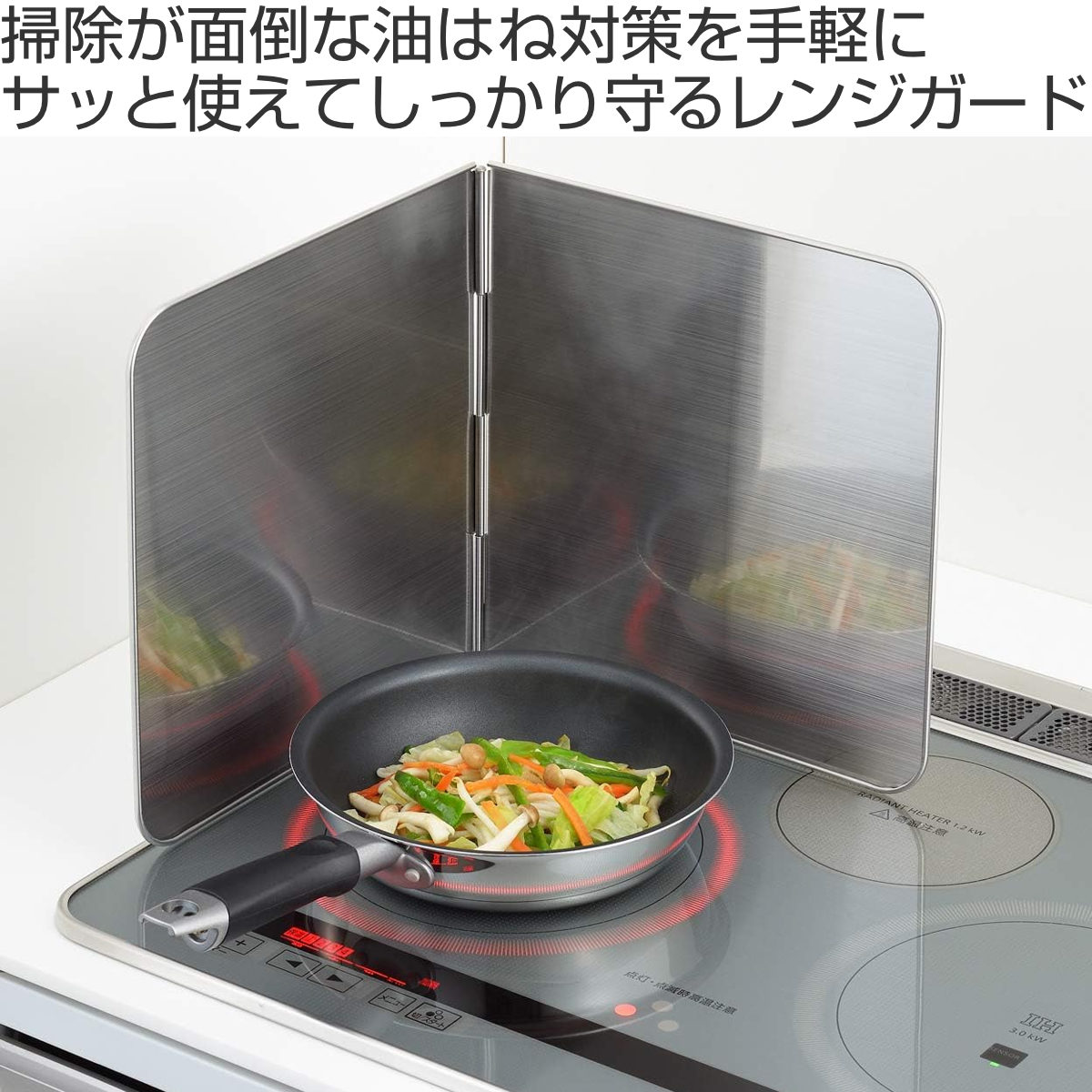 フライパンや鍋のそばに立てるだけの簡単設置で手軽に使えます。2面タイプなので、コンロやIH、鍋などのサイズを気にせずにお使いいただけます。