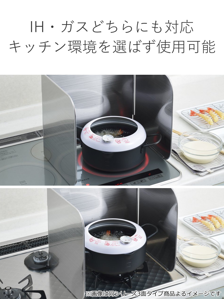 IHコンロにもガスコンロにも対応。ご家庭のキッチン環境を選ばず使用でき、安定感のある設計で油はねや汚れをしっかりガード。毎日の調理を快適にサポートします。