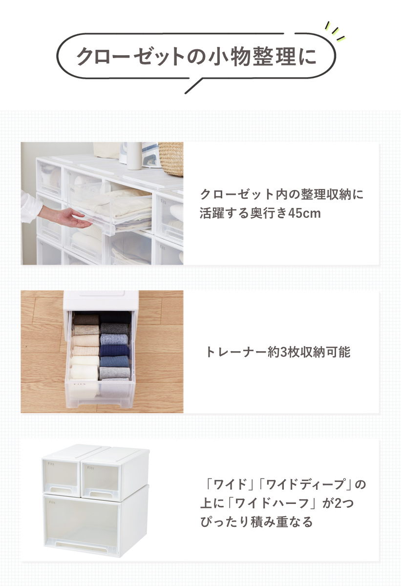 | 備考 | キャスター取り付け不可 1個あたりの収納目安:セーターなら約2枚、トレーナーなら約3枚、半袖ポロシャツなら約5枚、フェイスタオルなら約20枚、靴下なら約30セット |