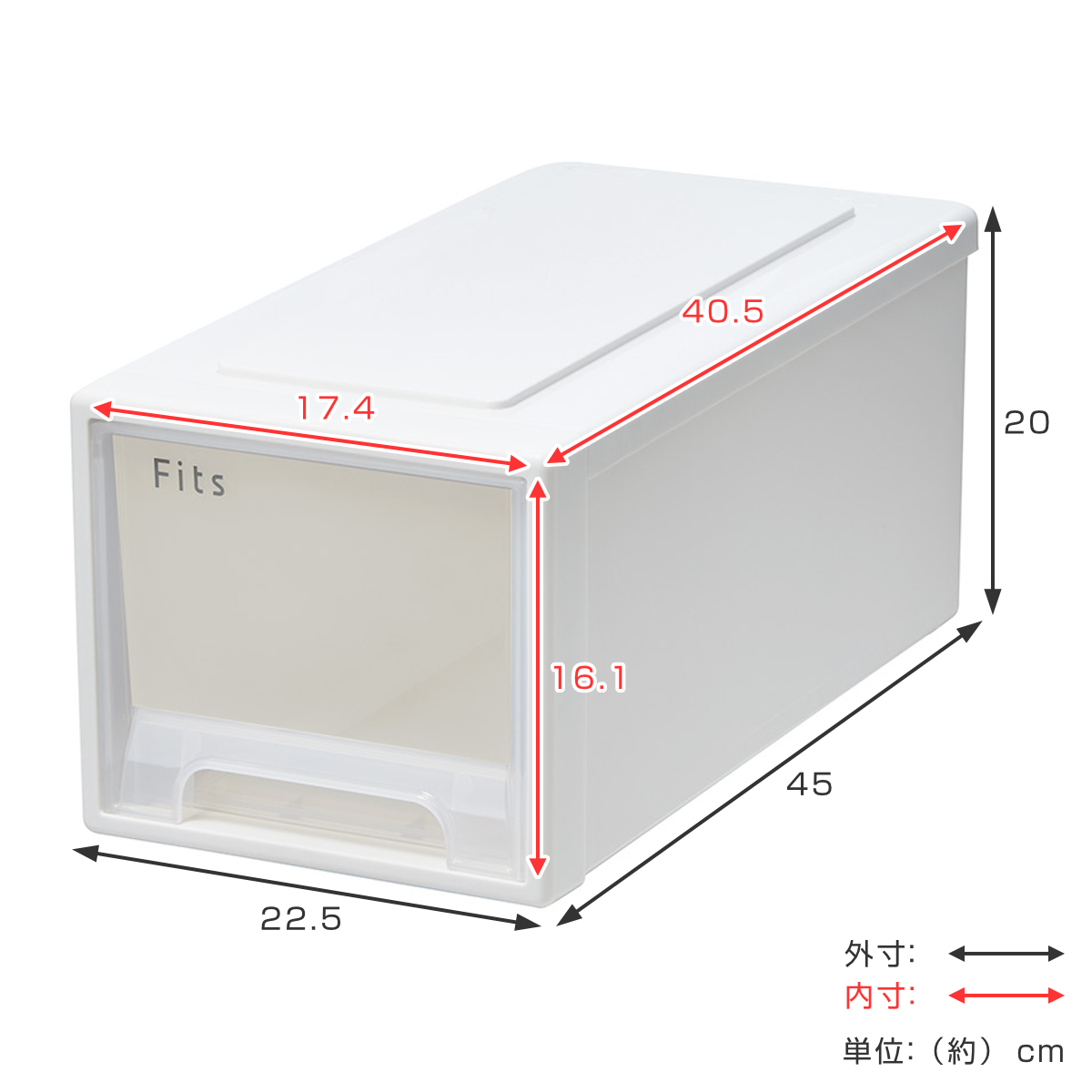 | 備考 | キャスター取り付け不可 1個あたりの収納目安:セーターなら約2枚、トレーナーなら約3枚、半袖ポロシャツなら約5枚、フェイスタオルなら約20枚、靴下なら約30セット |