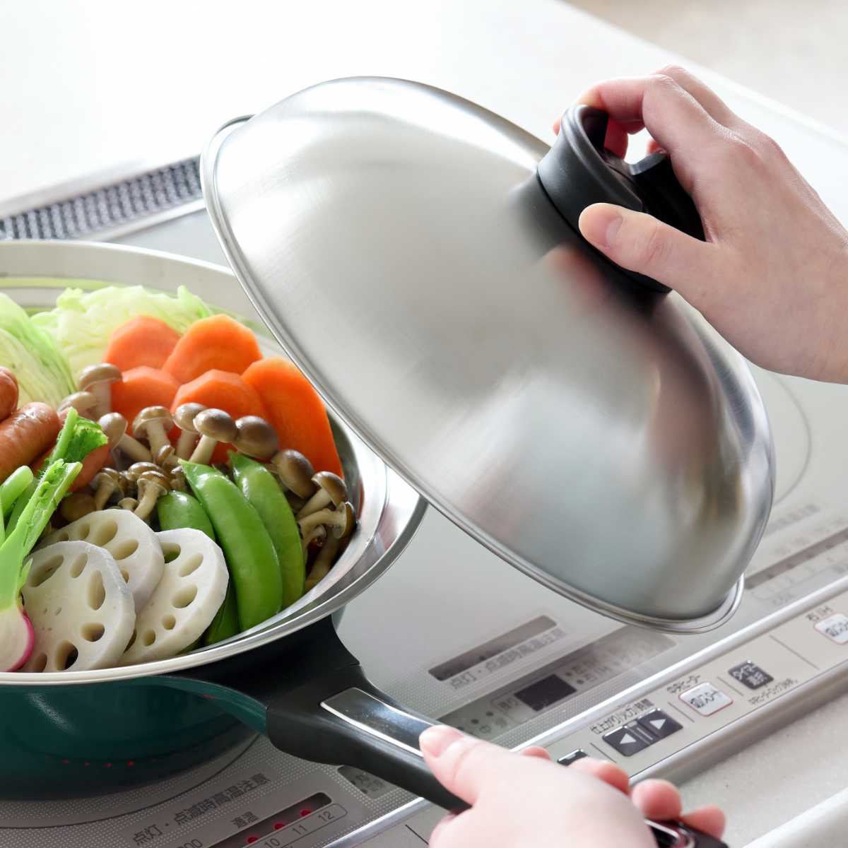 蒸しプレートの蒸気穴から、余分な油がフライパンや鍋の中に落ちるので、ヘルシーに蒸し上げることができます。