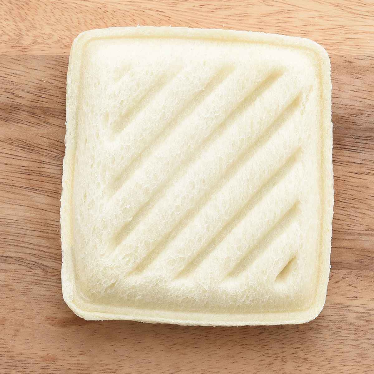 本体の型のフチがカッターになっているので、食パンを1枚ずつ抜き、フタで波目をつけます。波目を付けると、食材がはみ出さず入れられる場所がわかりやすくなります。最後は具材をはさんでギュッと押したら完成です。フチが付きにくい場合は電子レンジで20~30秒ほど温めると付きやすくなります。