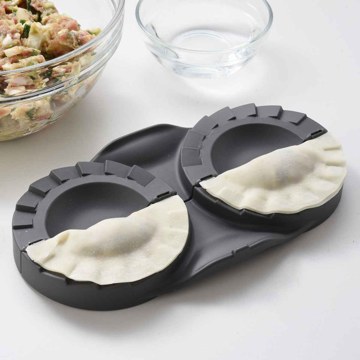 こんがりと焼き目のついた餃子、美味しいですよね。でも、餃子の皮で包むのは意外と大変だったりします。「ぎょうざメーカーダブル」は餃子の皮を包む面倒な作業が、誰でもカンタンにキレイにできるお助けグッズです。2つ同時に作ることができるので時短になり、みんなで楽しむ餃子パーティにも大活躍します。
