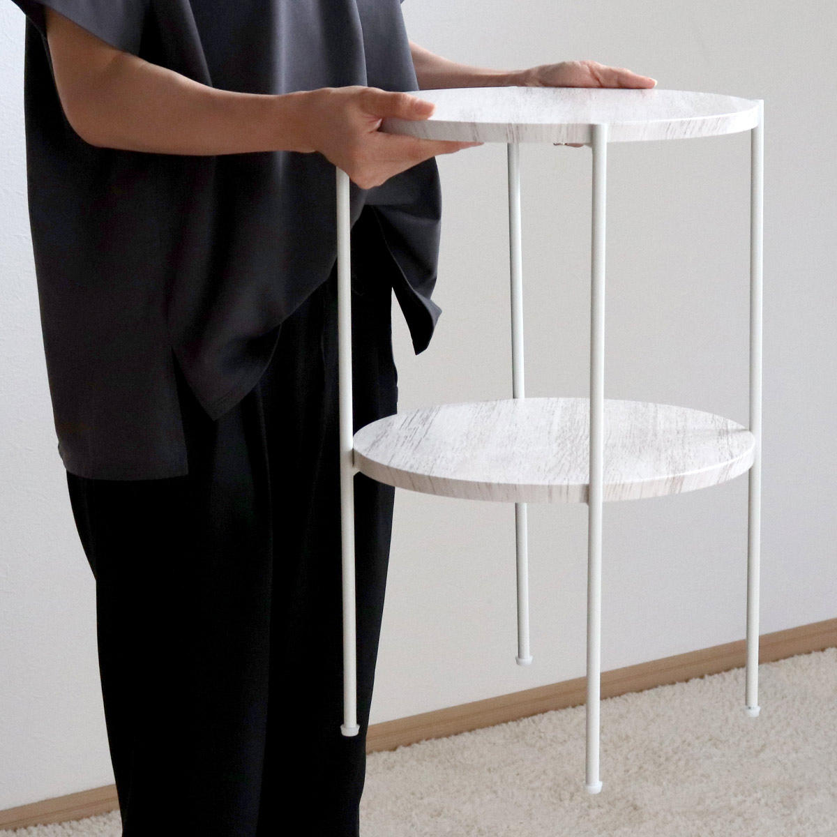 2段式でコンパクトサイズなので、ソファサイド以外にも様々なシーンで便利にお使いいただけます。ベッド横のナイトテーブルとして使ったり、玄関では鍵などよく使うものを置いておけるテーブルとして使うのにおすすめです。リビングではお気に入りの小物を飾るディスプレイ台としてや、観葉植物の置き場所としてもお使いいただけます。