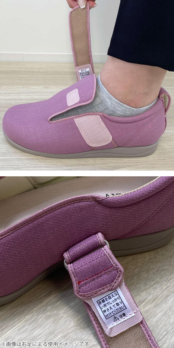 内素材がやわらかくベルトが甲全体に優しくフィットするので、むくみや腫れがあるときも、足の状態に合わせてベルトで調整できます。外反母趾の方や足ゆびに変形・痛みがある方、甲高の方にもおすすめです。ベルトは面ファスナーの調整によって+2cmまで延長できます。