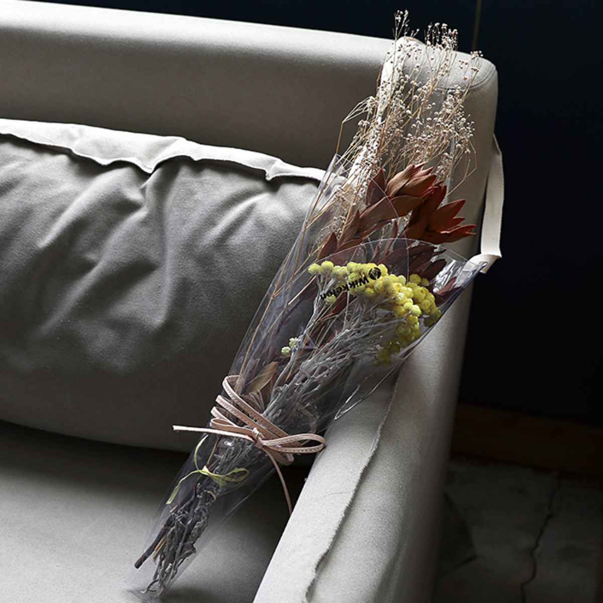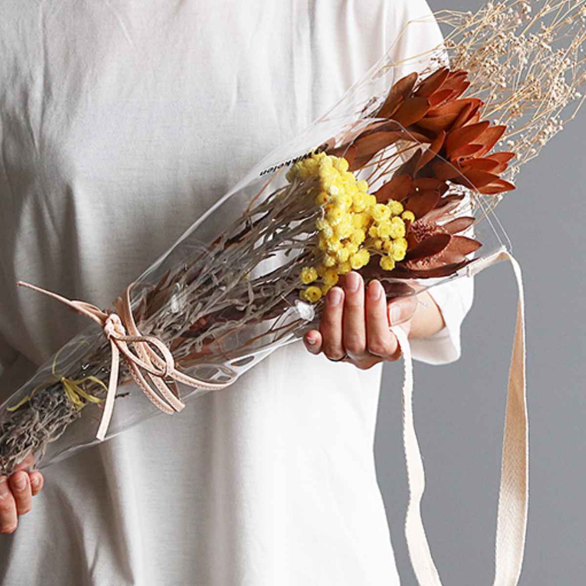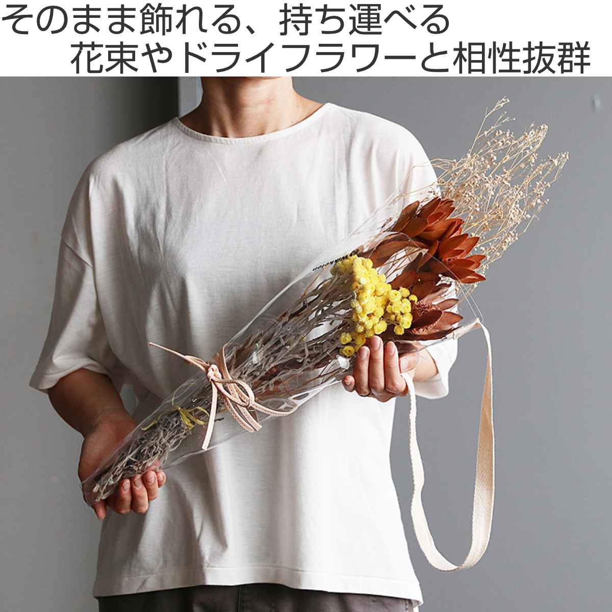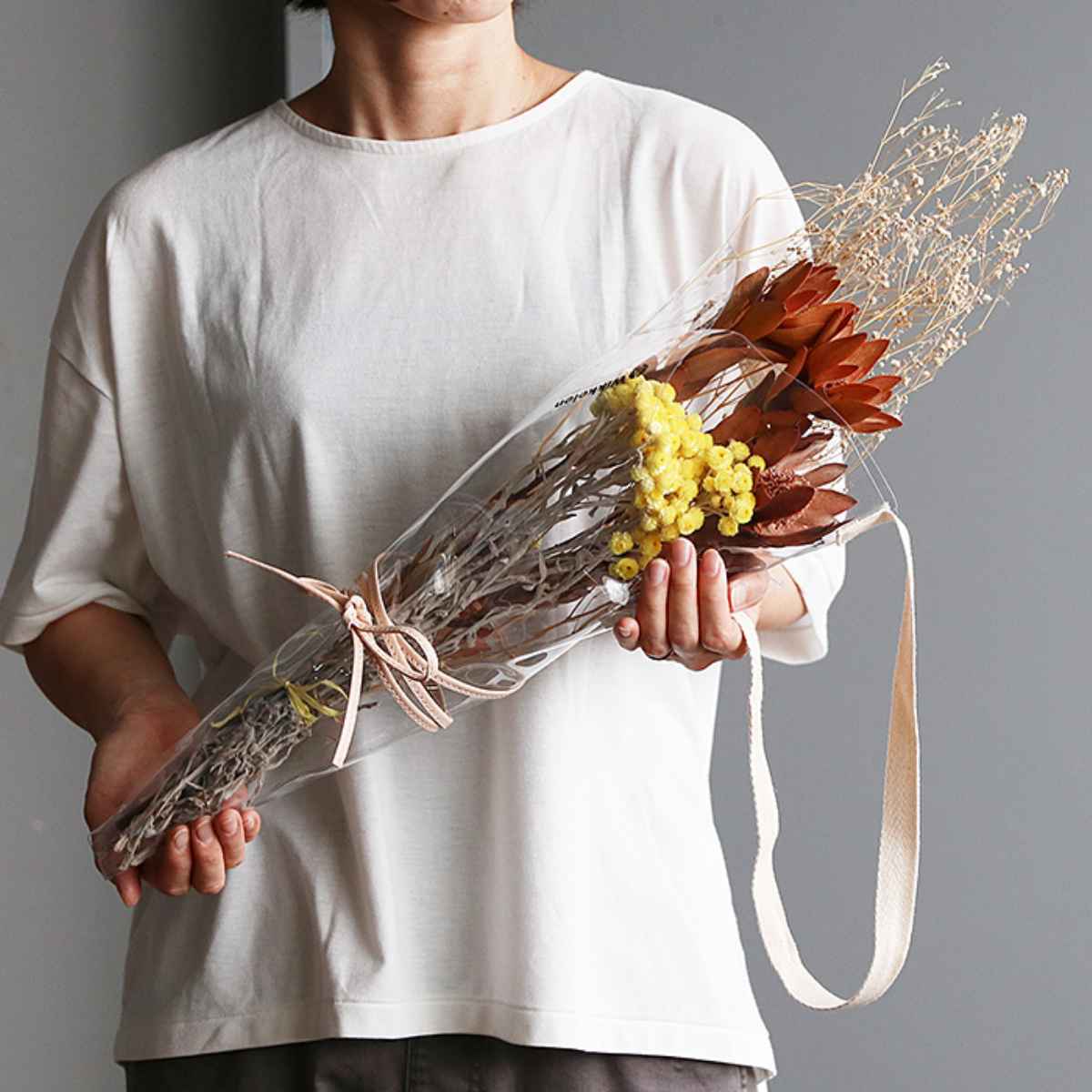 素材は透明感があるビニールを使用しております。透き通ったクリアなデザインは、よりブーケを引き立たせてくれます。小さめのブーケの場合は、下部を折り込んで、サイズ調整も可能です。取っ手付きなので持ち運びに便利です。