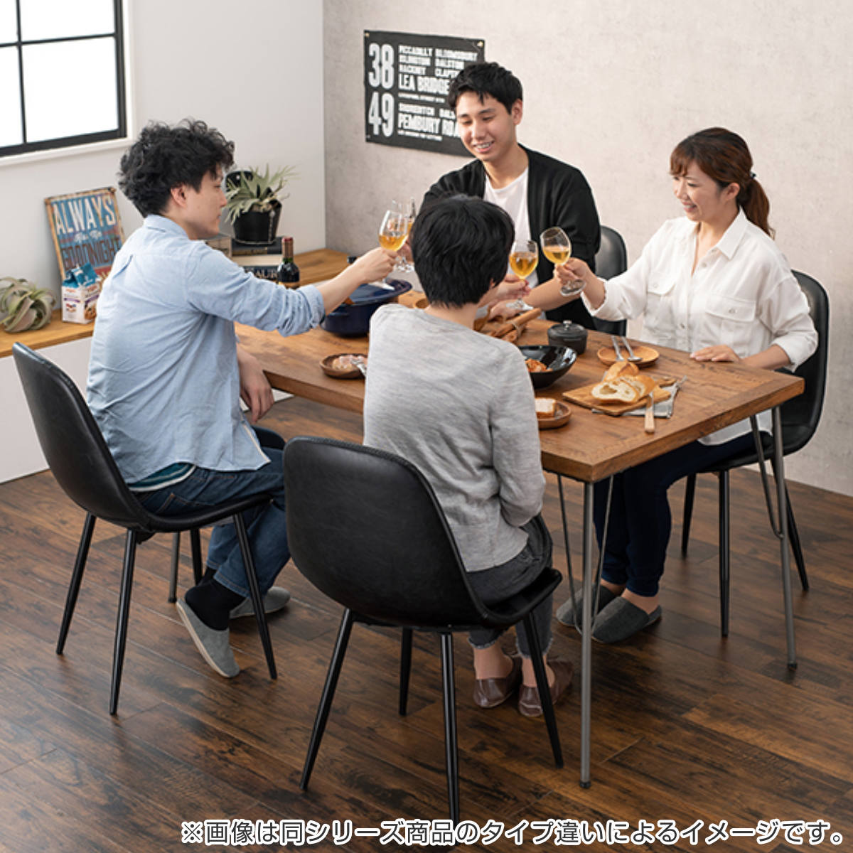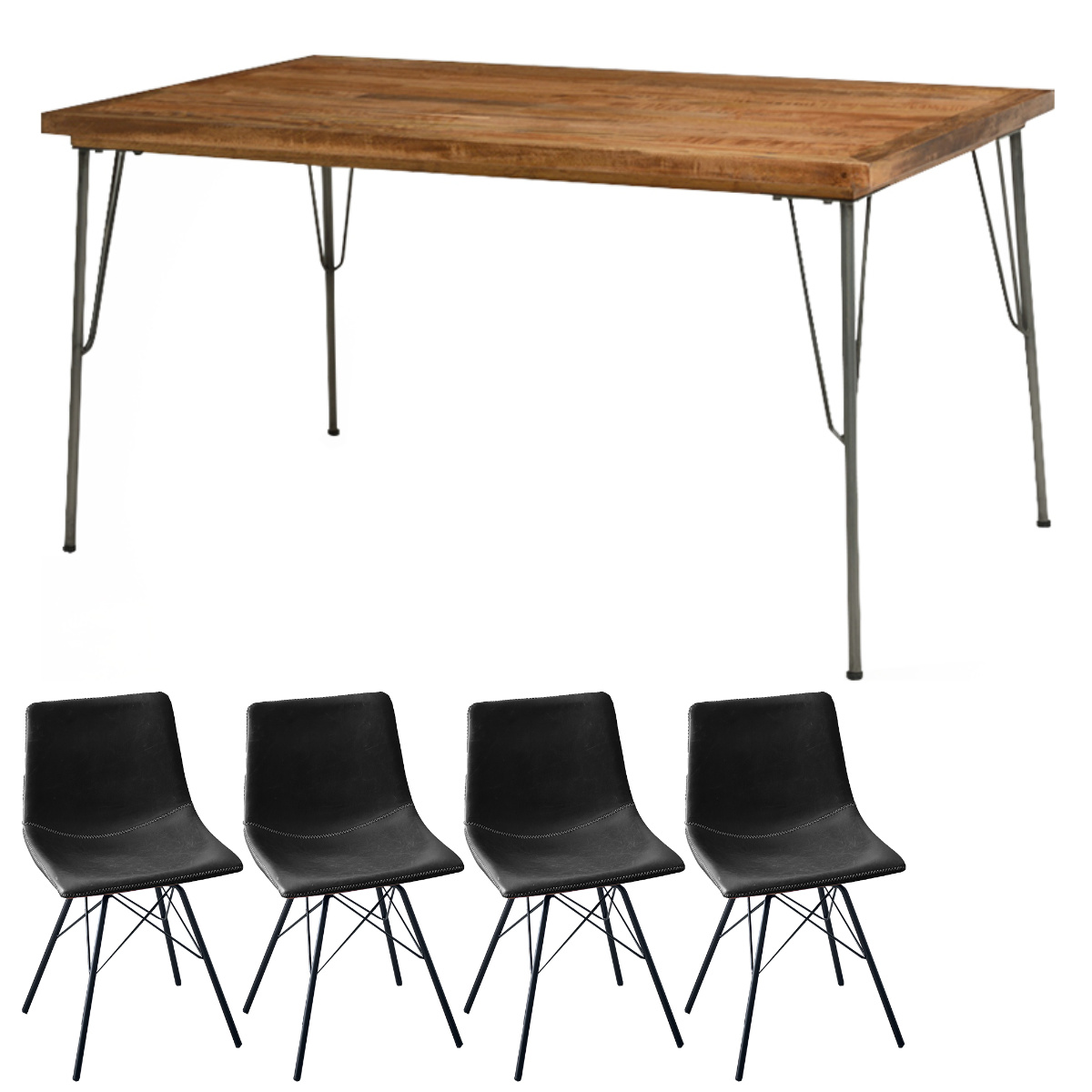 無垢の天然木天板に、アイアン脚を組み合わせたダイニングテーブルと、合成皮革の張り地にアイアン脚を組み合わせたダイニングチェア。異素材MIXの組み合わせでヴィンテージ感たっぷりの空間を演出できる、おしゃれなダイニング5点セットです。