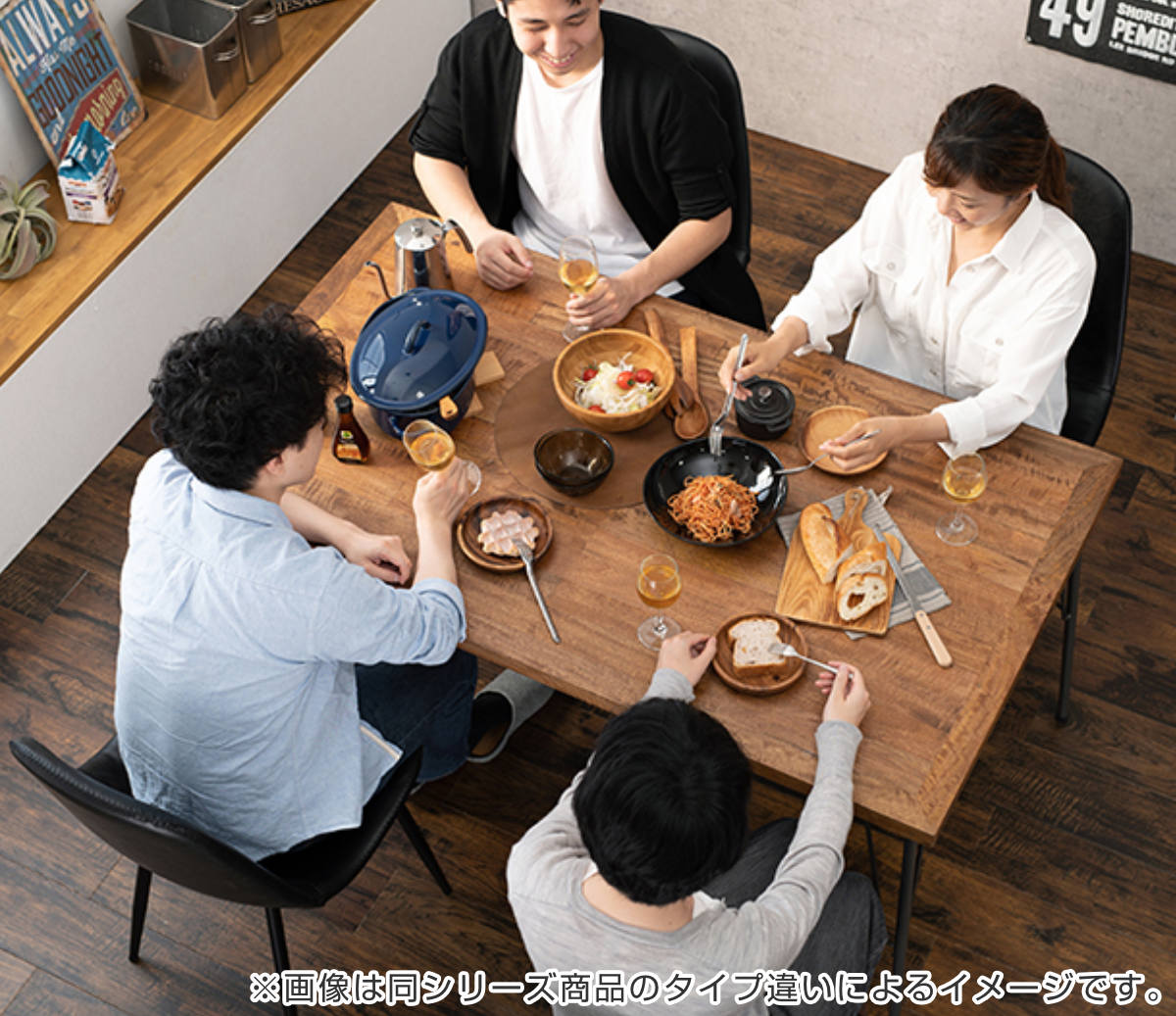 約幅140cm×奥行80cmと大きすぎないサイズ感のテーブルは、圧迫感なく使いやすい大きさです。たくさんの料理が置けるので、家族団らんやホームパーティーでも活躍します。スリムなアイアン脚で、大人4人が座っても狭さを感じさせません。