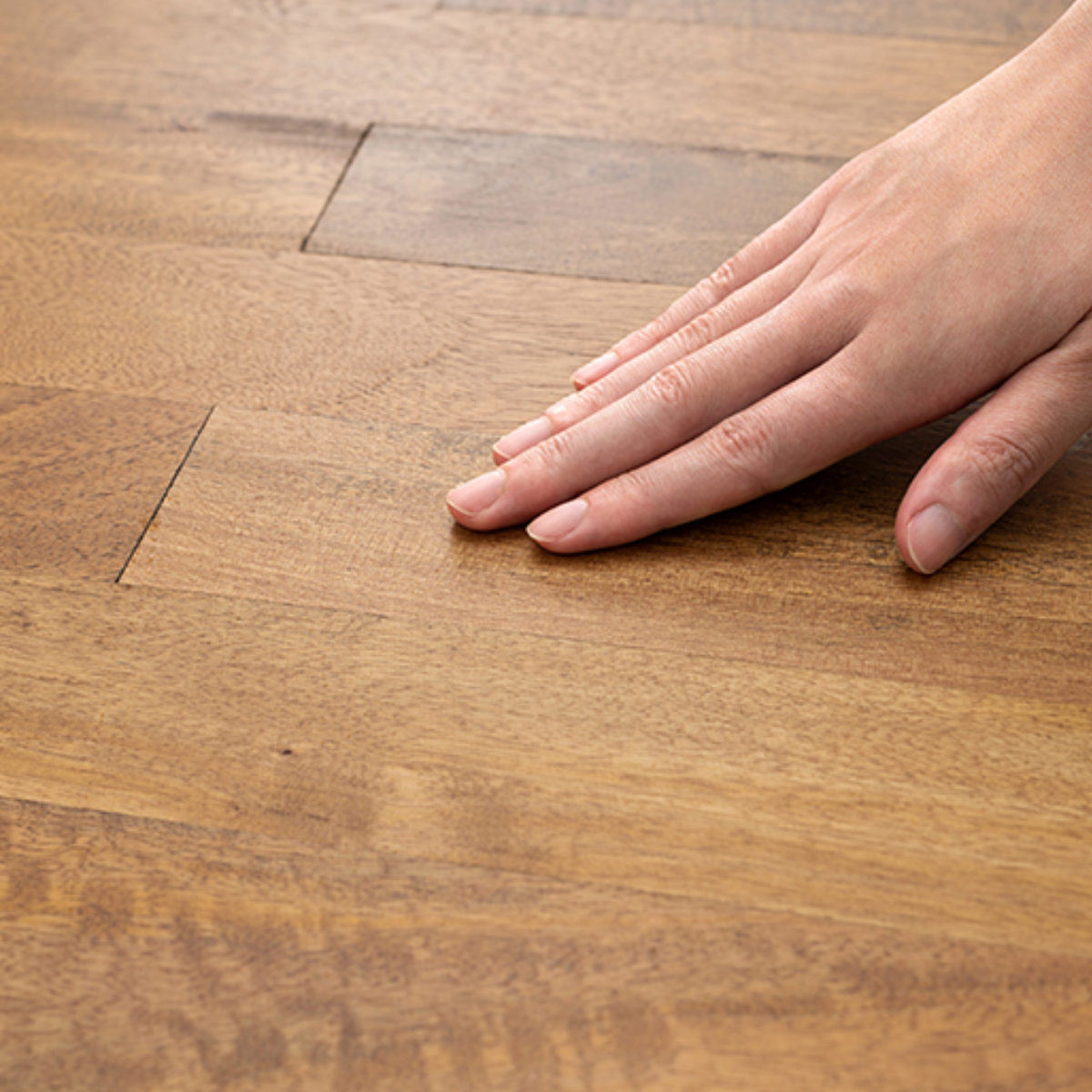 天板には滑らかな手触りと木目の風合いの艶やかさが特徴の、マンゴーウッドの天然無垢材を贅沢に使用しています。ラッカー塗装を施すことで天然木の質感を生かした仕上がりになっています。木そのものを板状に加工しつなぎ合わせる無垢集成材を使用することで、重厚感があり長く使うほど味わい深い風合いが出ます。