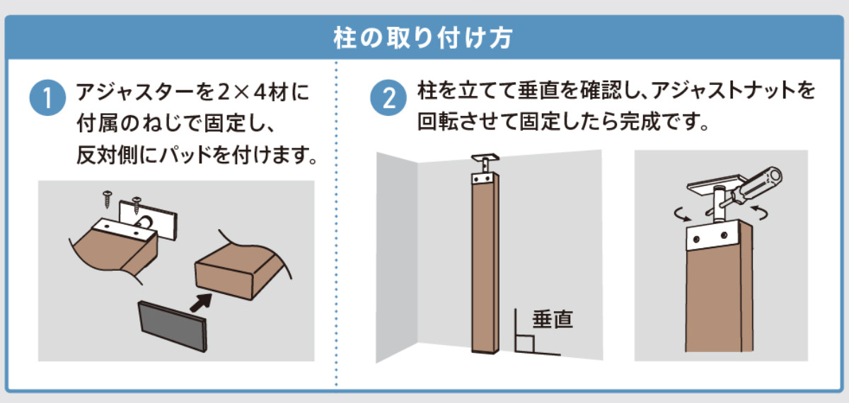壁に穴を開けずに2×4材を突っ張って支柱を立てるDIYパーツ