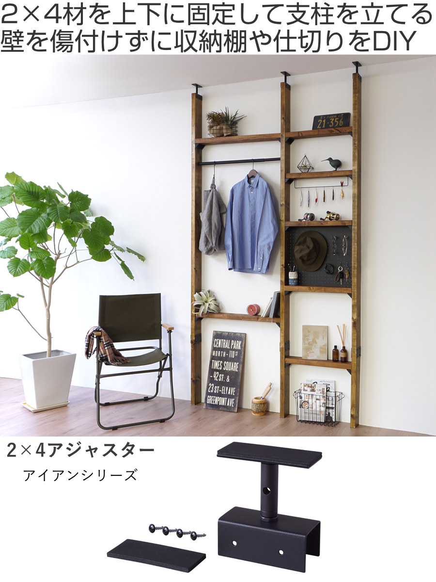 2×4木材を床と天井に突っ張り、DIYの基礎となる支柱を立てるためのアジャスターパーツです。アイアン製で、素材の質感を生かしたインテリアとして活用できます。シェルフサポート(棚受)やアイアンロッド(ハンガーポール)など、別売りのアイアンシリーズを組み合わせることで、統一感のある棚を手軽に作ることができます。