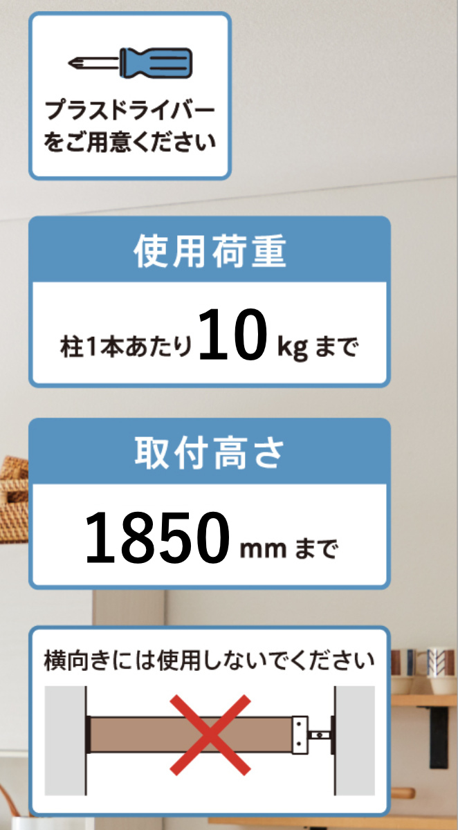 | 注意事項 | ※木材は付属しておりません。 ※この商品は縦突っ張り専用です。横向きには使用しないでください。 ※下地のしっかりした場所に設置してください。下地の弱い所に設置すると転倒の原因となったり、天井を破損したりする恐れがあります。 ※傾斜した天井、床面には設置しないでください。転倒の原因になります。 ※柱に対し片側に荷重が掛かる場合は10kgまでとしてください。 ※商品ページ内には別の商品を含む画像を使用しています |