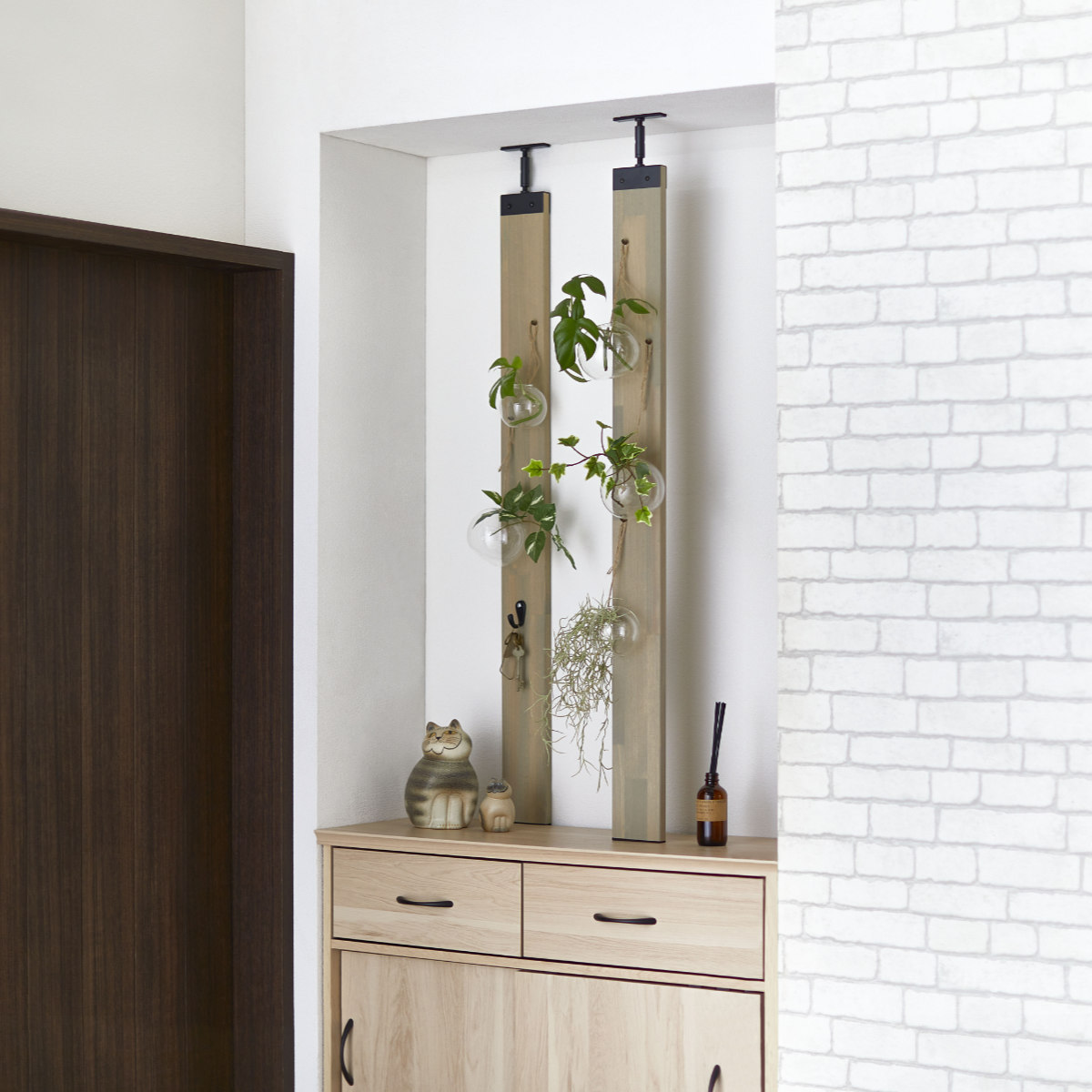 1×4木材を床と天井に突っ張り、DIYの基礎となる支柱を立てるためのアジャスターパーツです。アイアン製で、素材の質感を生かしたインテリアとして活用できます。シェルフサポート(棚受)やアイアンロッド(ハンガーポール)など、別売りのアイアンシリーズを組み合わせることで、統一感のある棚を手軽に作ることができます。
