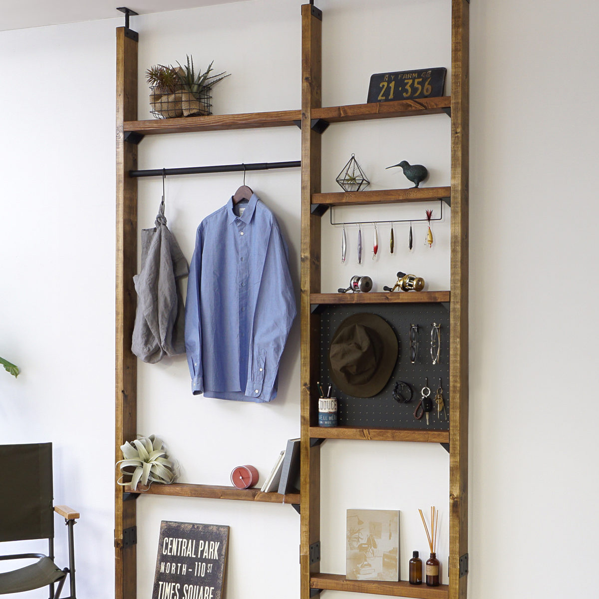 ラブリコのアジャスターシリーズで立てた柱と組み合わせることで、壁面を傷付けずに「ハンガーラック付き壁面収納」をDIYすることができます。