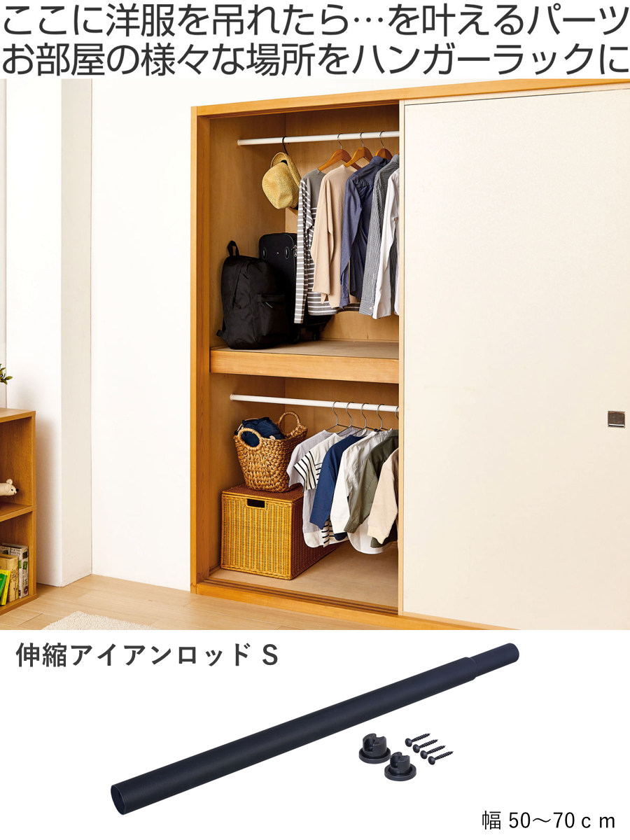 柱と柱、壁と壁の間、タンスや押し入れ、本棚など様々な場所に好きな幅、好きな高さでポールを取り付けられます。安心・安全に配慮した商品設計で、住まいに合わせた自由なサイズで様々な場所に設置が可能です。