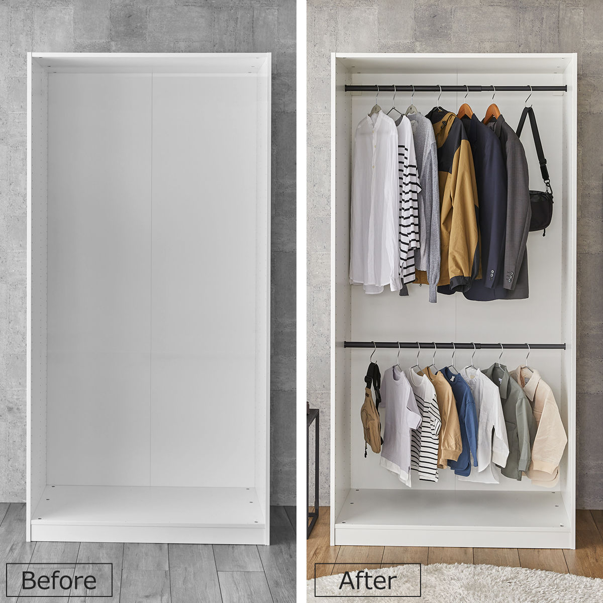 季節ごとのワードローブを掛けるハンガーポールは、荷重による落下が気になるものです。こちらはねじでしっかり固定する構造のため、設定荷重内であれば安心してご使用いただけます。
