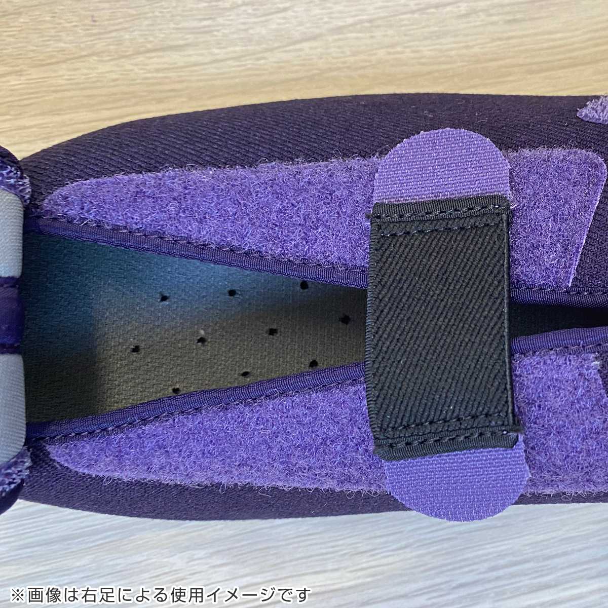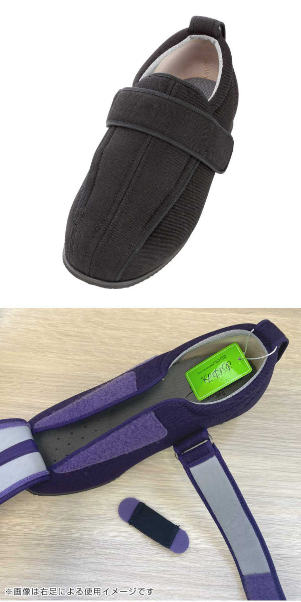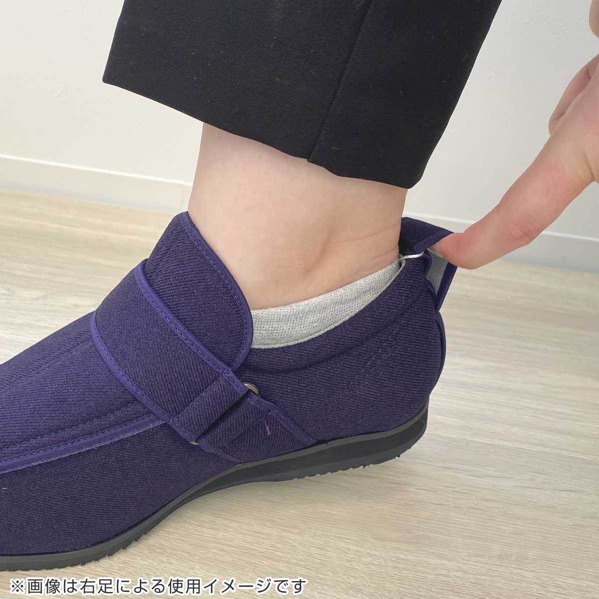 甲の部分に補助ベルトが付いているので足にしっかりフィットし、歩行時も安心です。補助ベルトは取り外し可能で、むくみや腫れがある時や下肢装具着時の足の状態に合わせて調整ができます。甲高や幅広の方にもおすすめです。