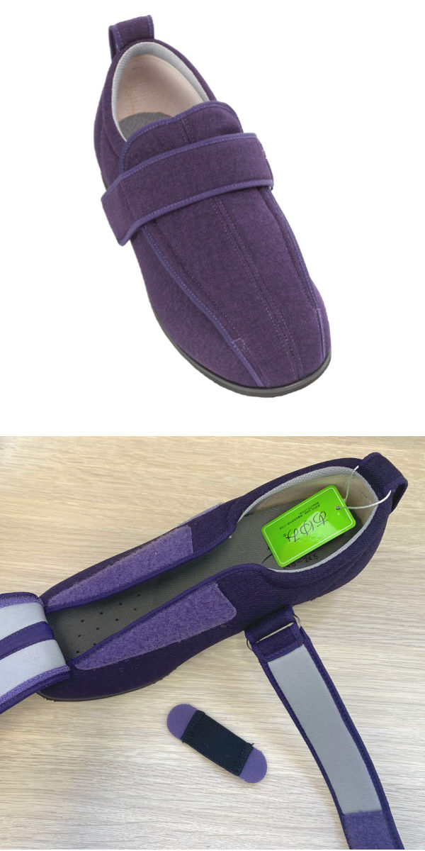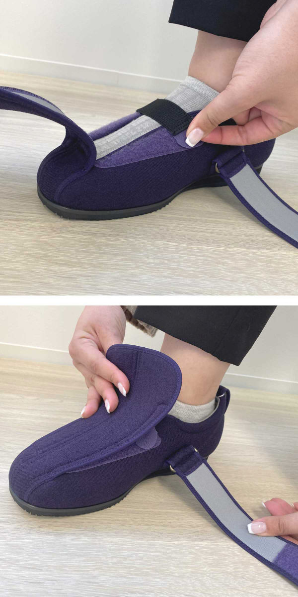 甲の部分に補助ベルトが付いているので足にしっかりフィットし、歩行時も安心です。補助ベルトは取り外し可能で、むくみや腫れがある時や下肢装具着時の足の状態に合わせて調整ができます。甲高や幅広の方にもおすすめです。