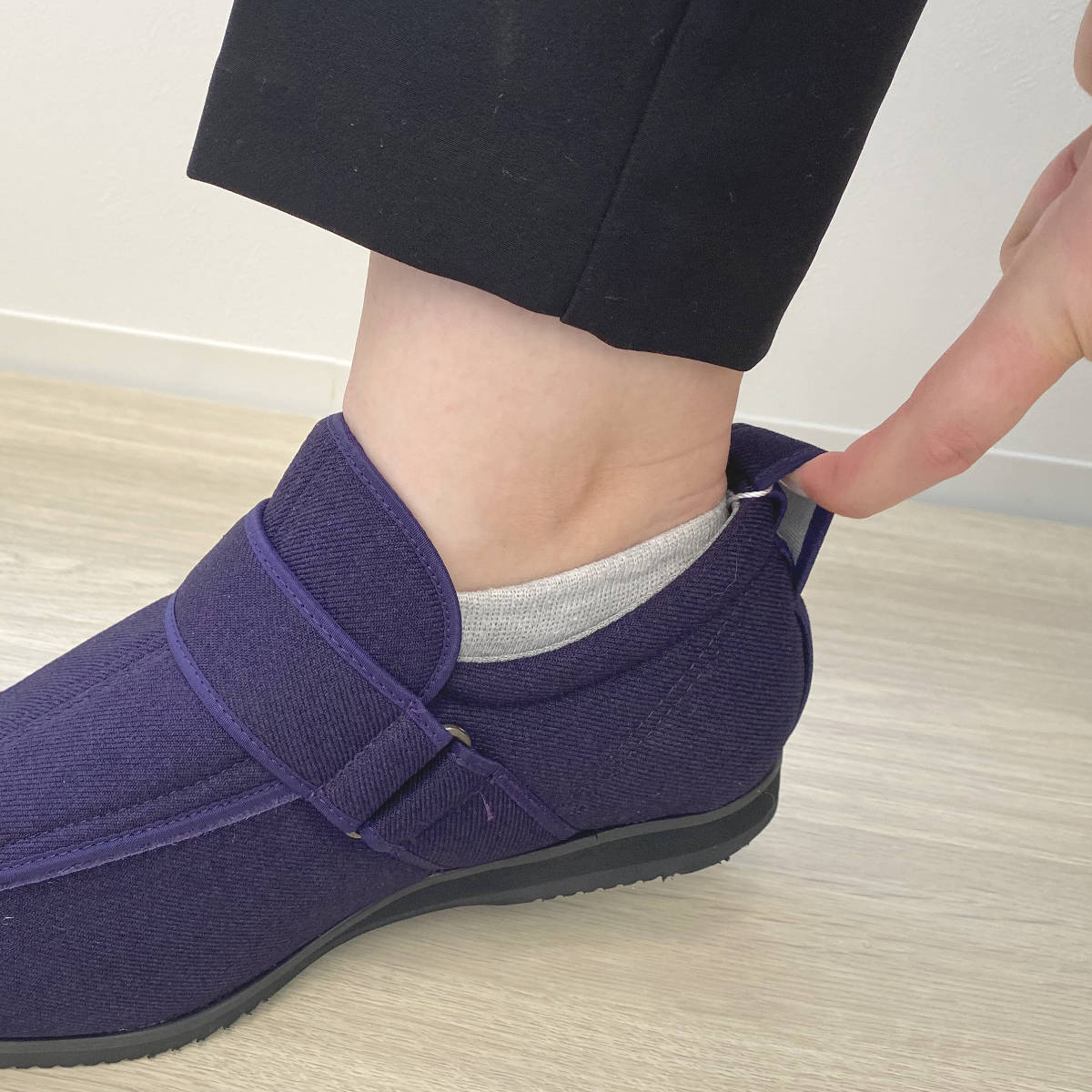 かかとの上部にループが付いているので、指に力が入りにくい人やシューズのかかとに指を入れて履くという細かい動作がしにくい人でも楽に履いていただけます。