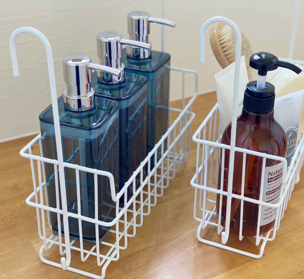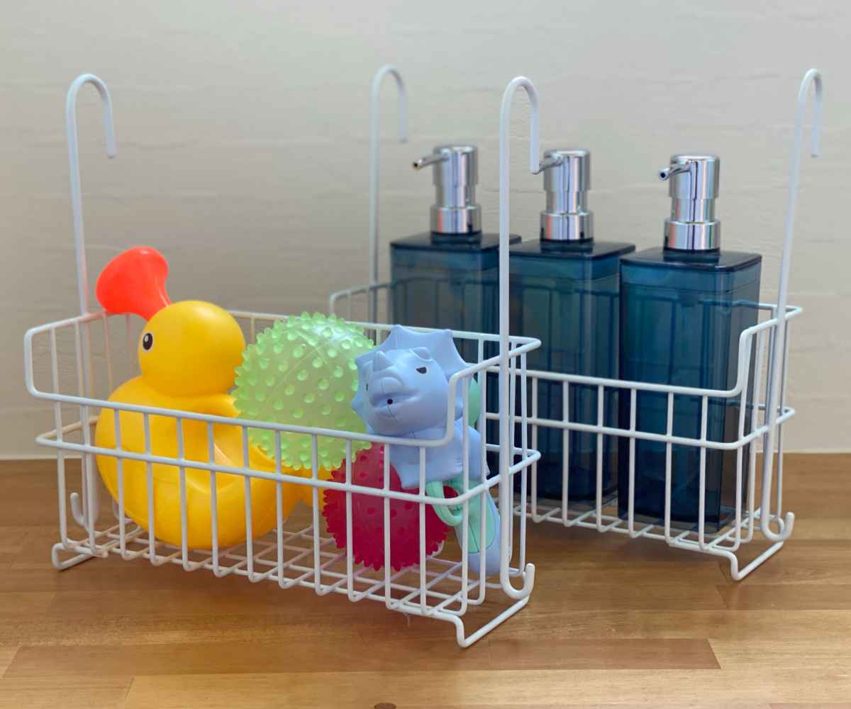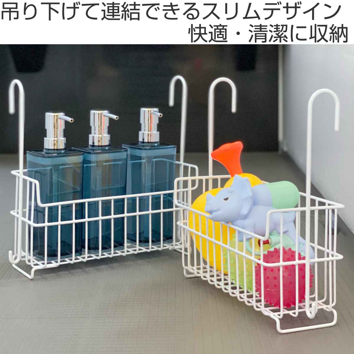 気が付けば増えているお風呂アイテムを、乾かしながら収納できる日本製のバスケットです。単品で引っかけてお使いいただけるのはもちろん、連結もできるタイプです。おもちゃ&お風呂グッズ、パパ用&ママ用など、分けて片づけたい時にも便利です。