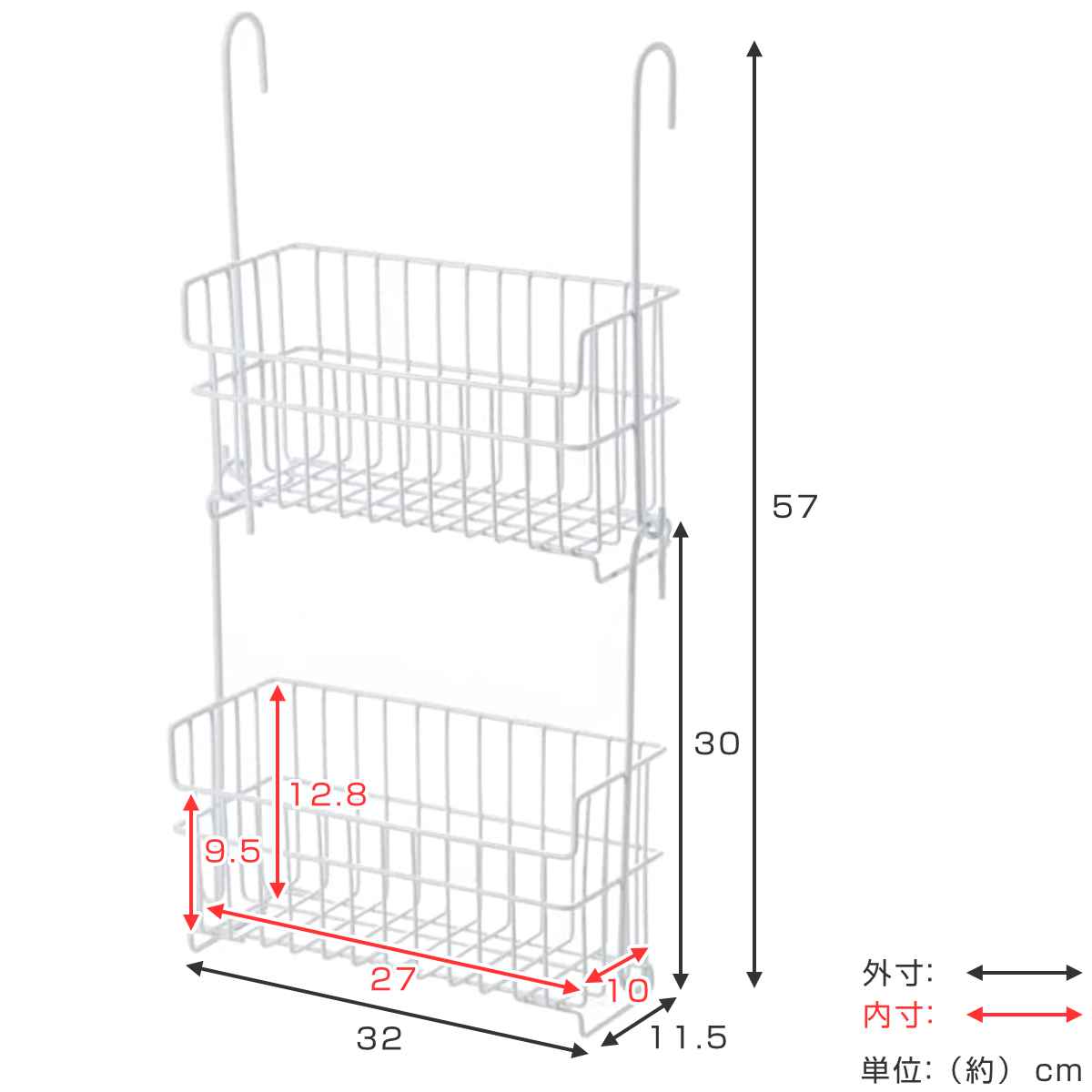 | サイズ | 外寸:約 幅32×奥行11.5×高さ30(cm) カゴ内寸:約 幅27×奥行10×深さ 前側9.5・後側12.8(cm) 連結時全長:約 57(cm) |