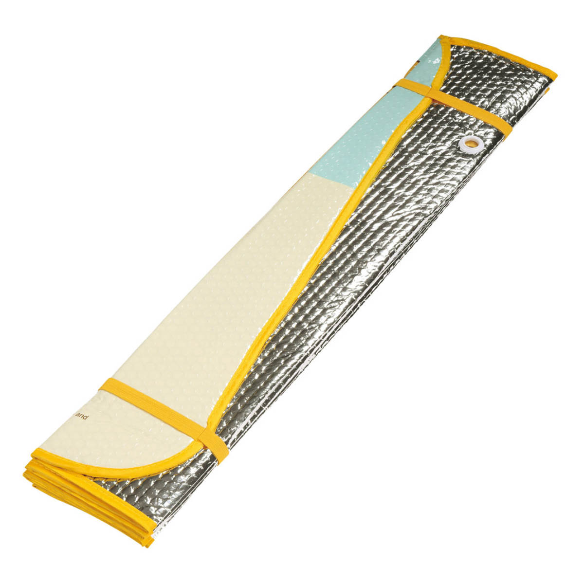 フロントガラスに設置するカーサンシェードです。アルミフィルム+エアパッキンで断熱効果を発揮し、アルミコーティング断熱材で車のガラス面から入り込む直射日光を防ぎます。ハンドル、ダッシュボード、シート等の炎天下の車内温度の上昇や車内のシート等の色あせも防ぎます。