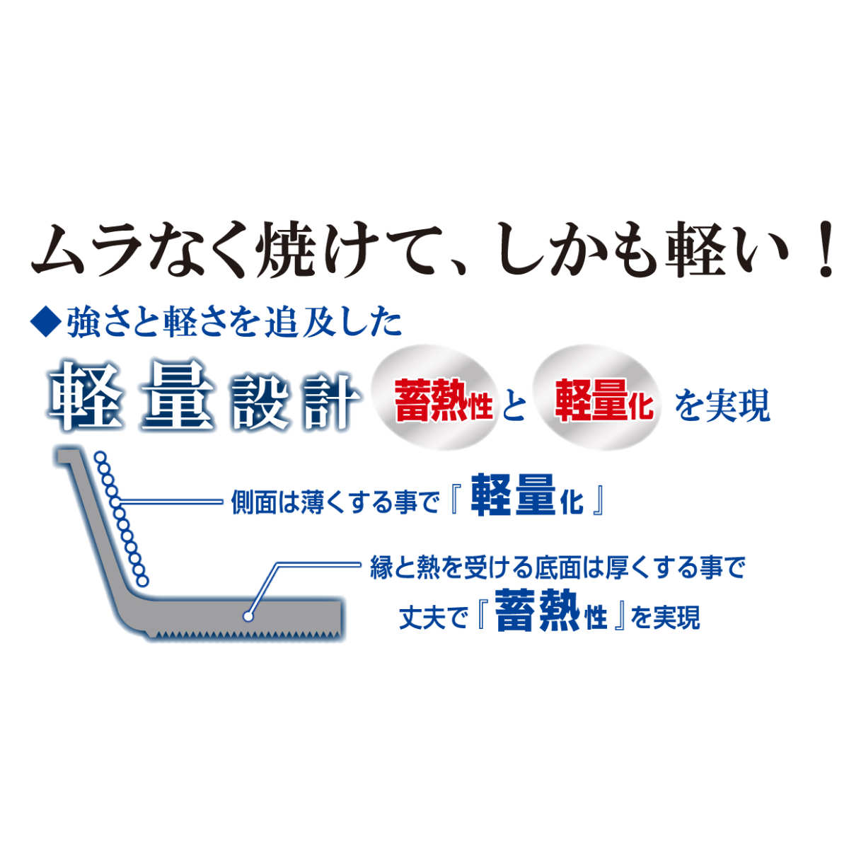 強さと軽さを追及した計量設計で、蓄熱性と軽量化を実現しました。側面は薄くすることで軽量化、縁と熱を受ける底面は厚くすることで、丈夫で蓄熱性があります。