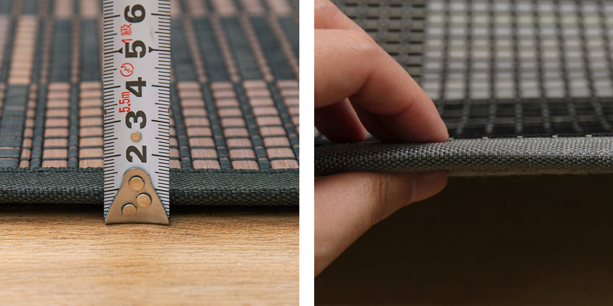 中材に約10mmのウレタンが挟み込まれています。しっかりとしたクッション性があり、座布団がなくても快適に過ごせます。3層構造になっているので防音効果もあり、集合住宅にお住まいの方にもおすすめです。