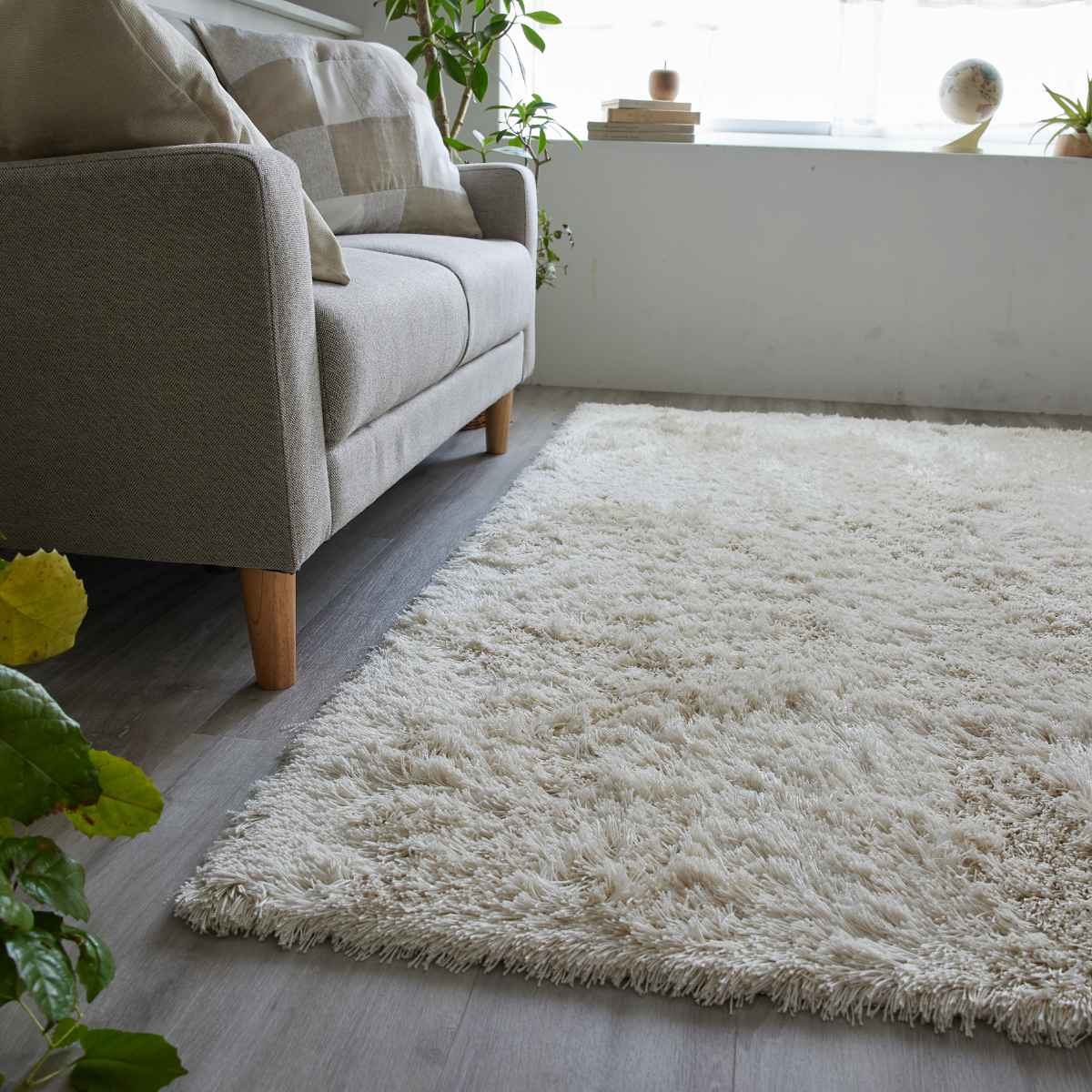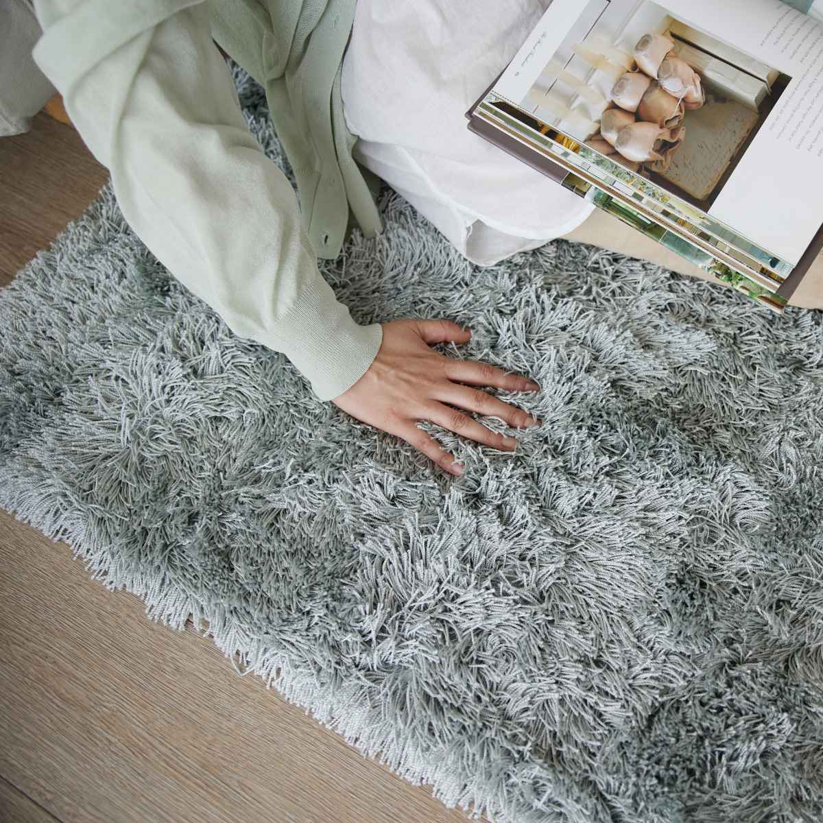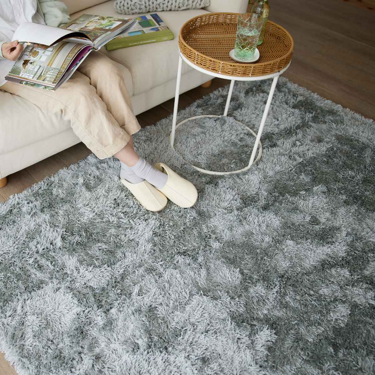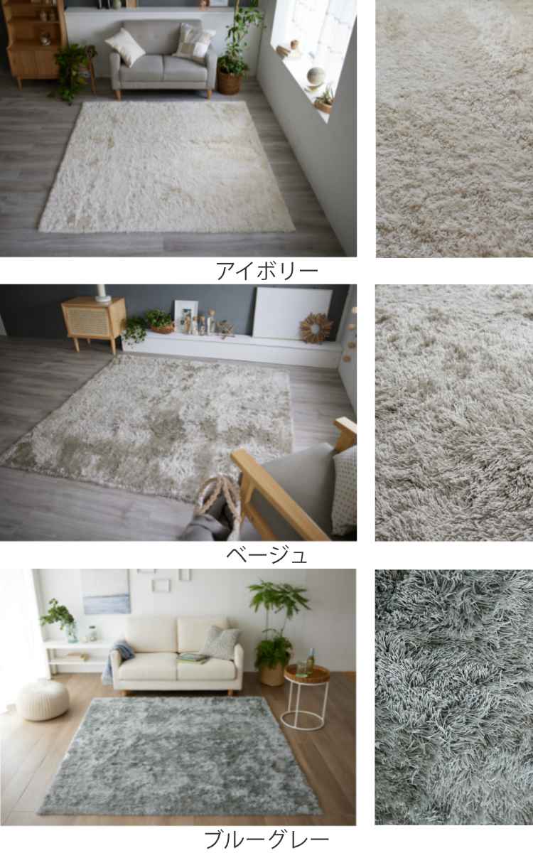 上品な光沢感のある、サラサラとした肌触りのシャギータイプのラグです。光沢の映えるベーシックなグレイッシュトーンで、シンプルながらも飽きの来ないデザインです。