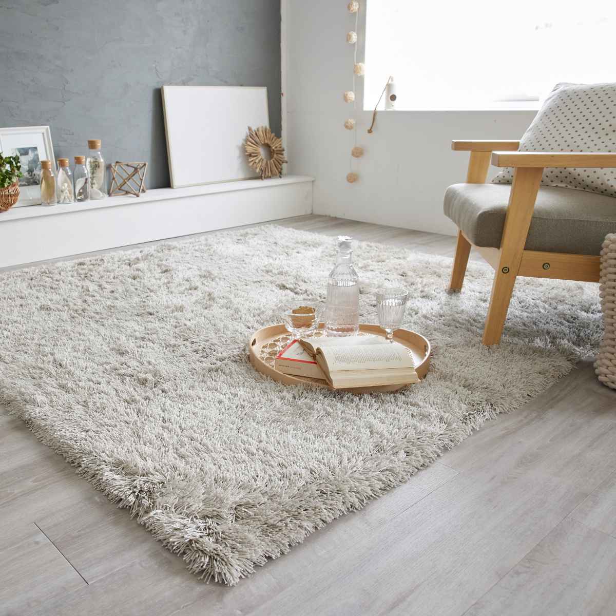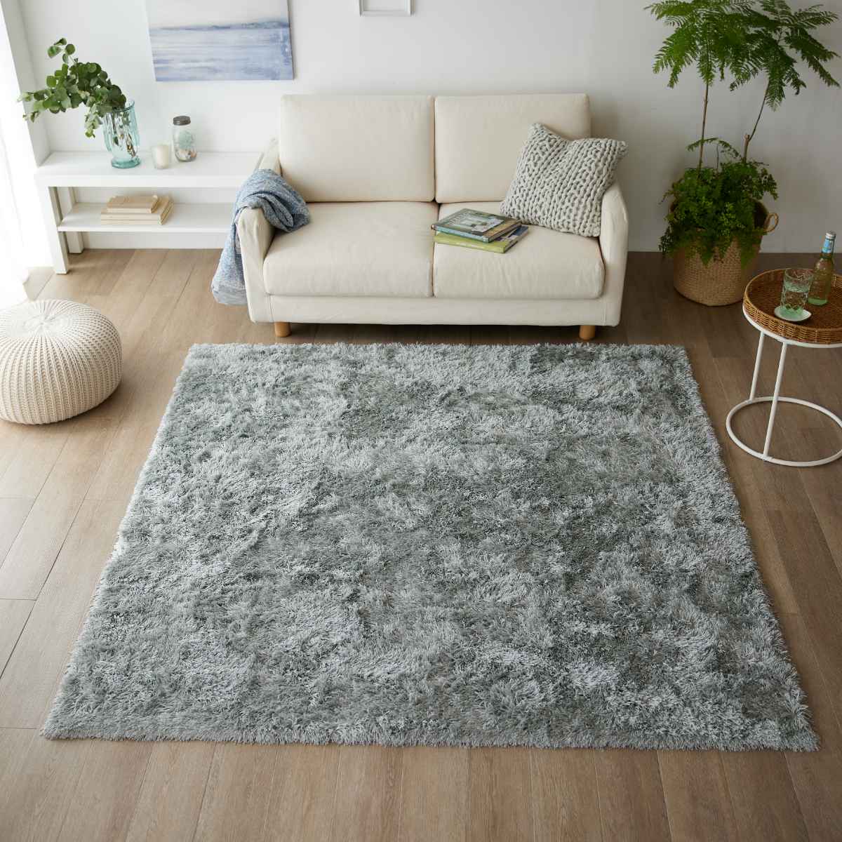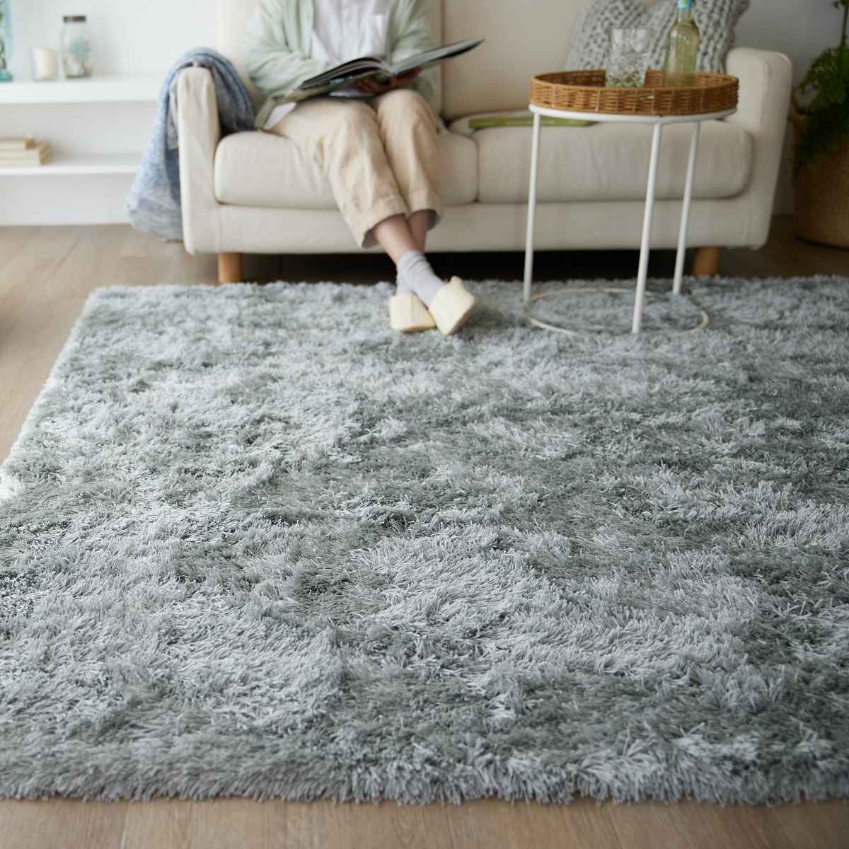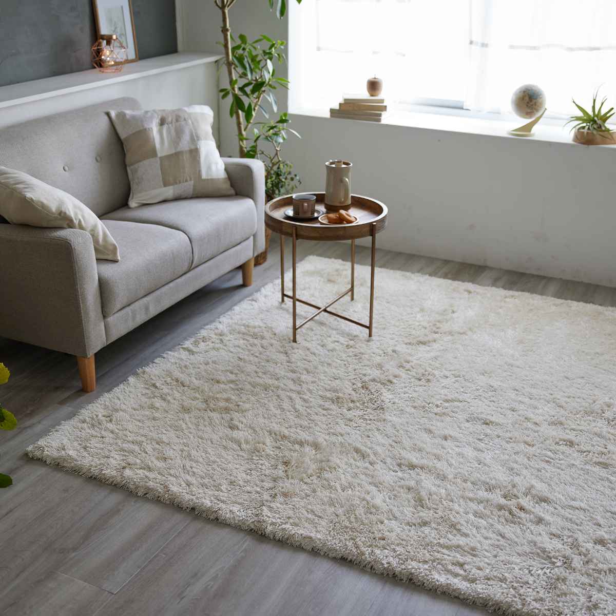上品な光沢感のある、サラサラとした肌触りのシャギータイプのラグです。光沢の映えるベーシックなグレイッシュトーンで、シンプルながらも飽きの来ないデザインです。