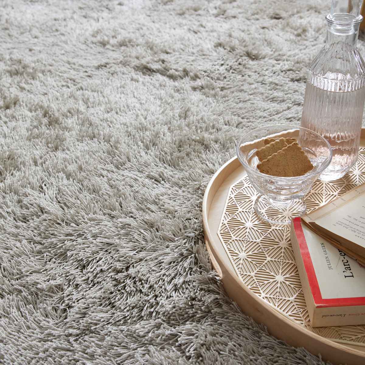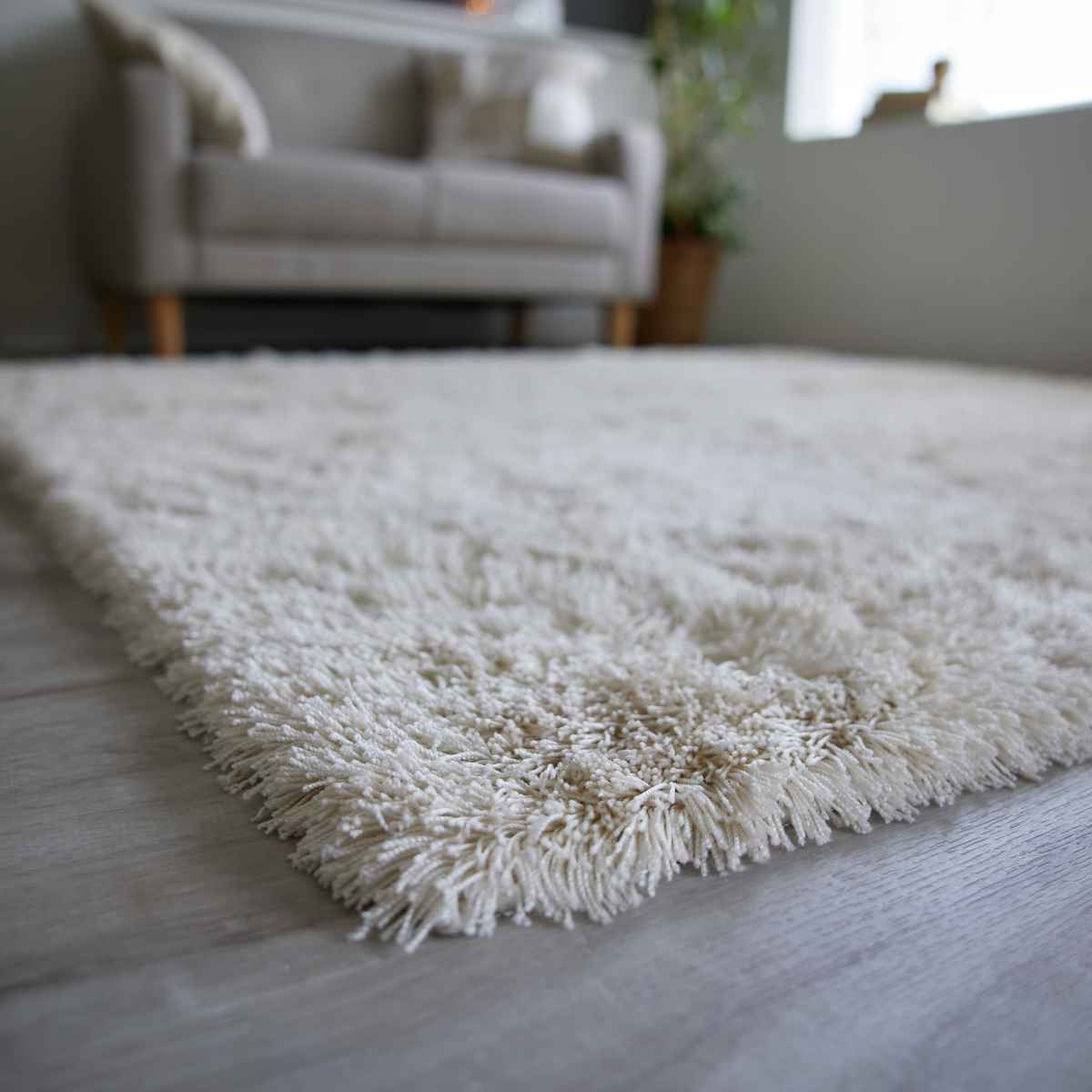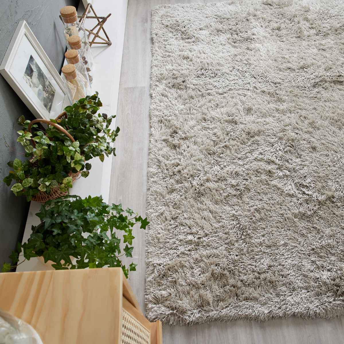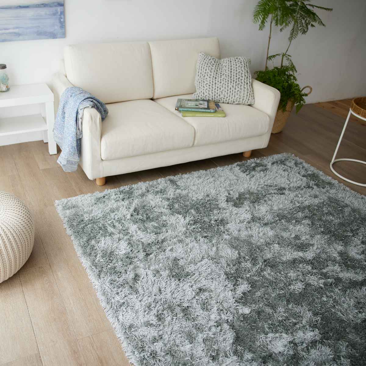 上品な光沢感のある、サラサラとした肌触りのシャギータイプのラグです。光沢の映えるベーシックなグレイッシュトーンで、シンプルながらも飽きの来ないデザインです。