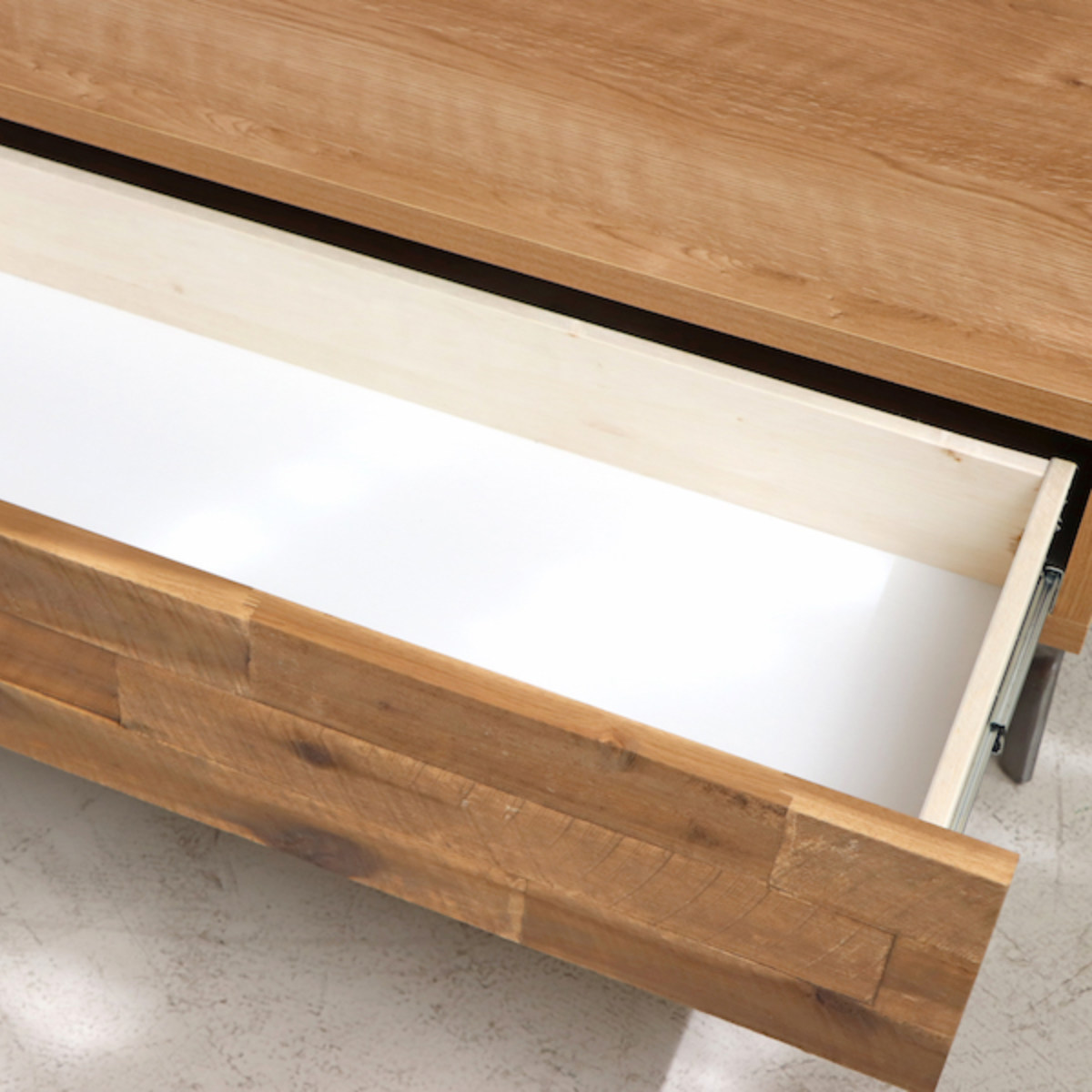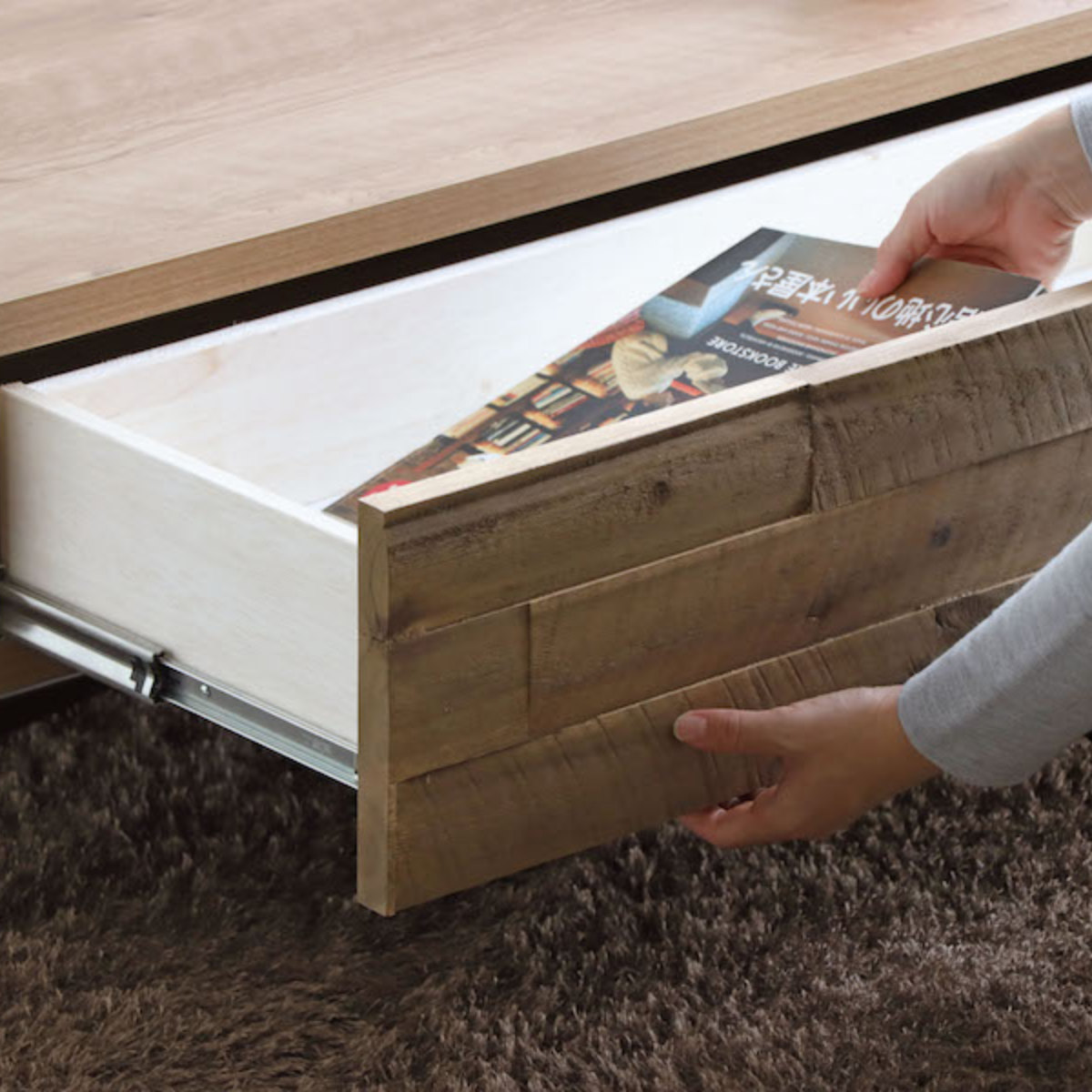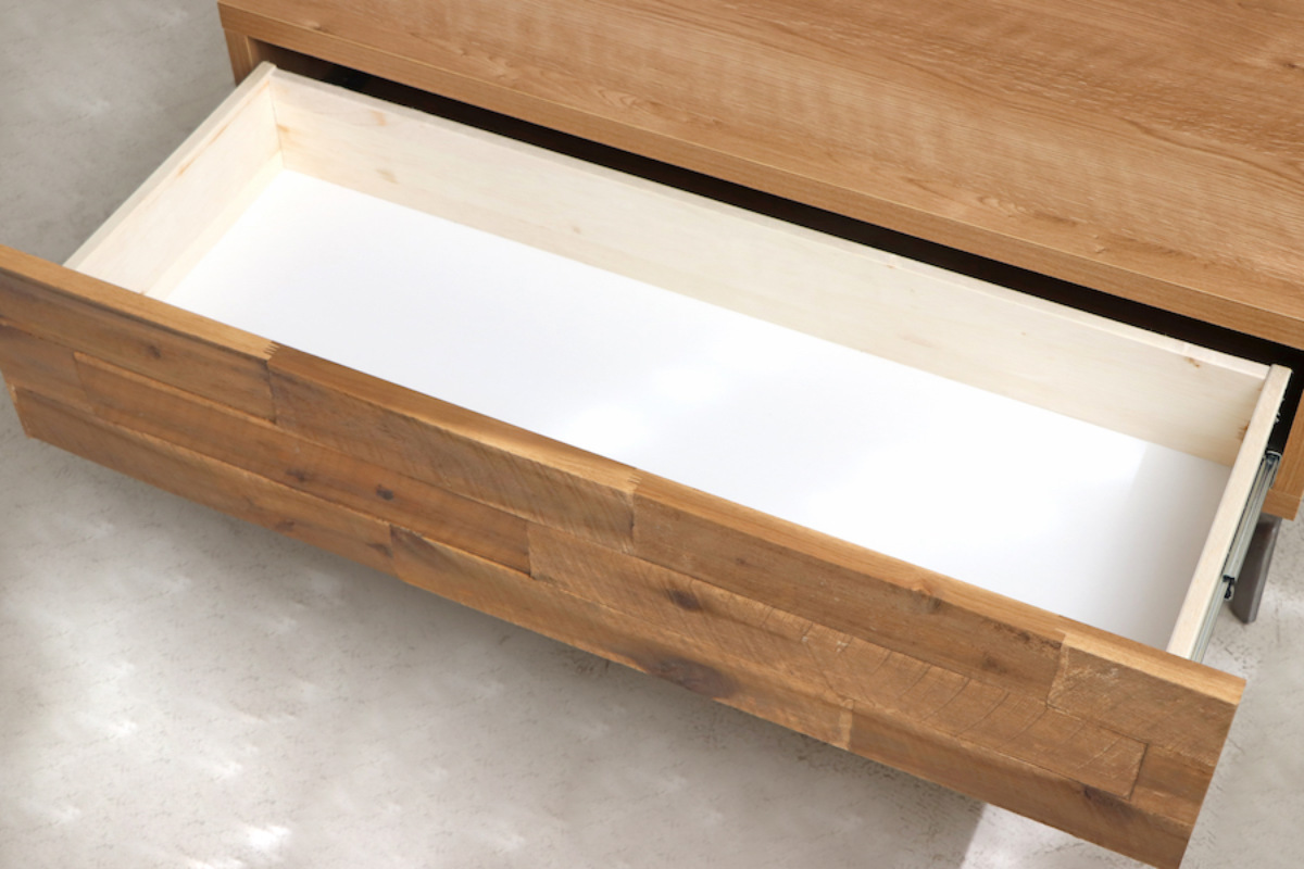 テーブルの前面にはスライドレールの大きな引出し付きです。いつもテーブルの上に出したままの雑誌やリモコンなどは、いつでも引出しの中にサッと片付けることができます。