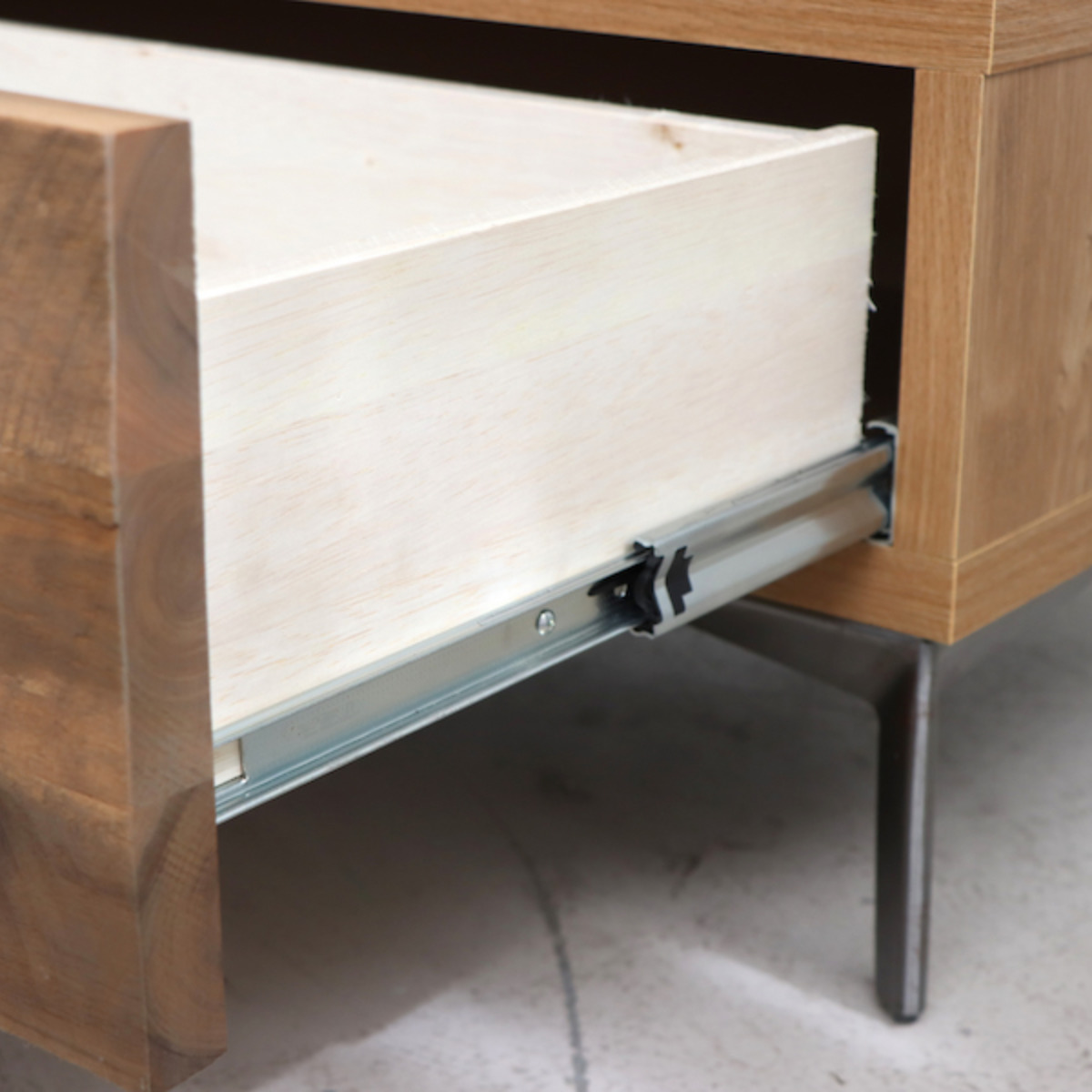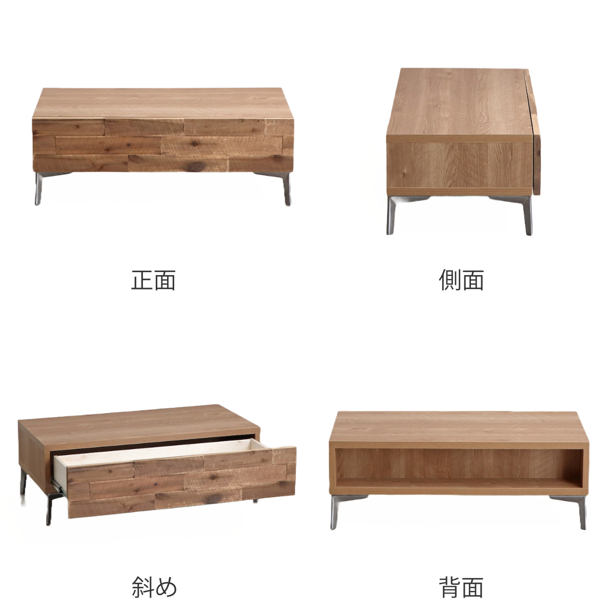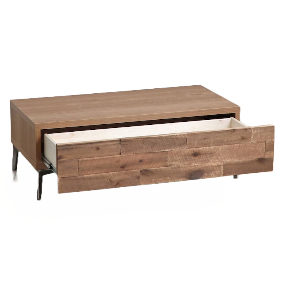 テーブルの前面にはスライドレールの大きな引出し付きです。いつもテーブルの上に出したままの雑誌やリモコンなどは、いつでも引出しの中にサッと片付けることができます。