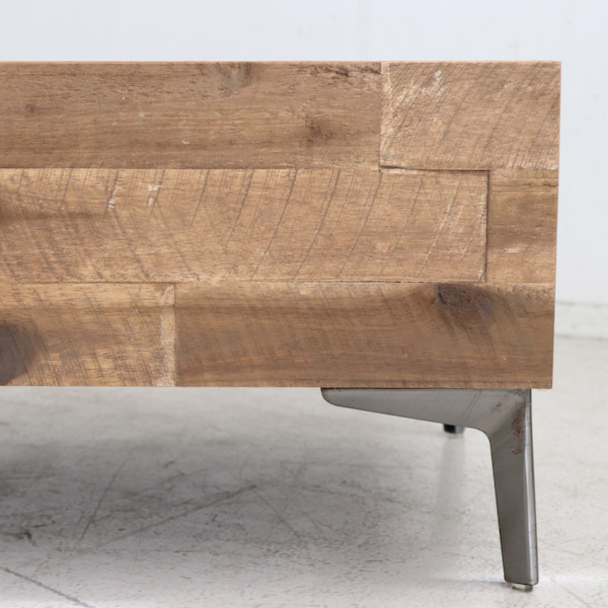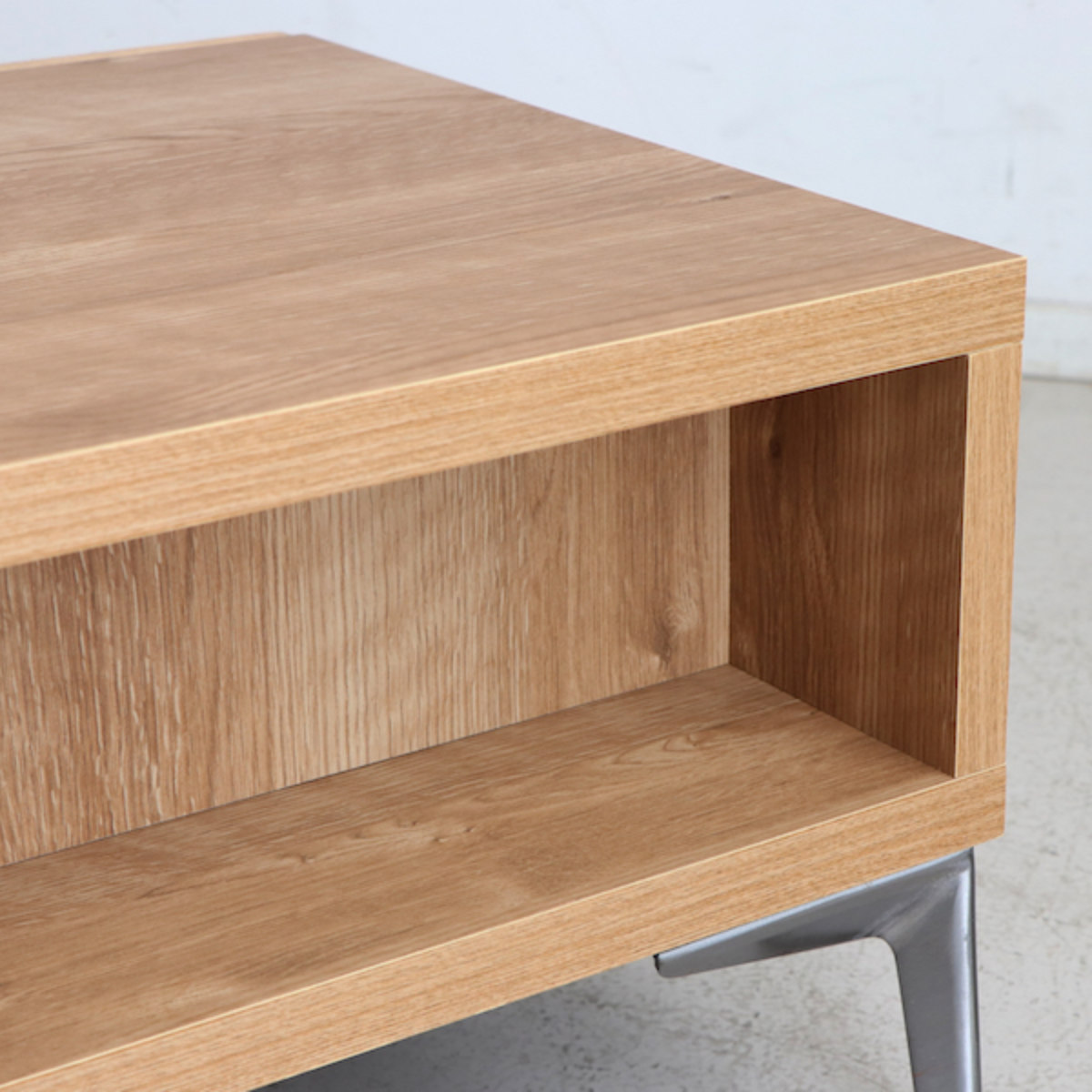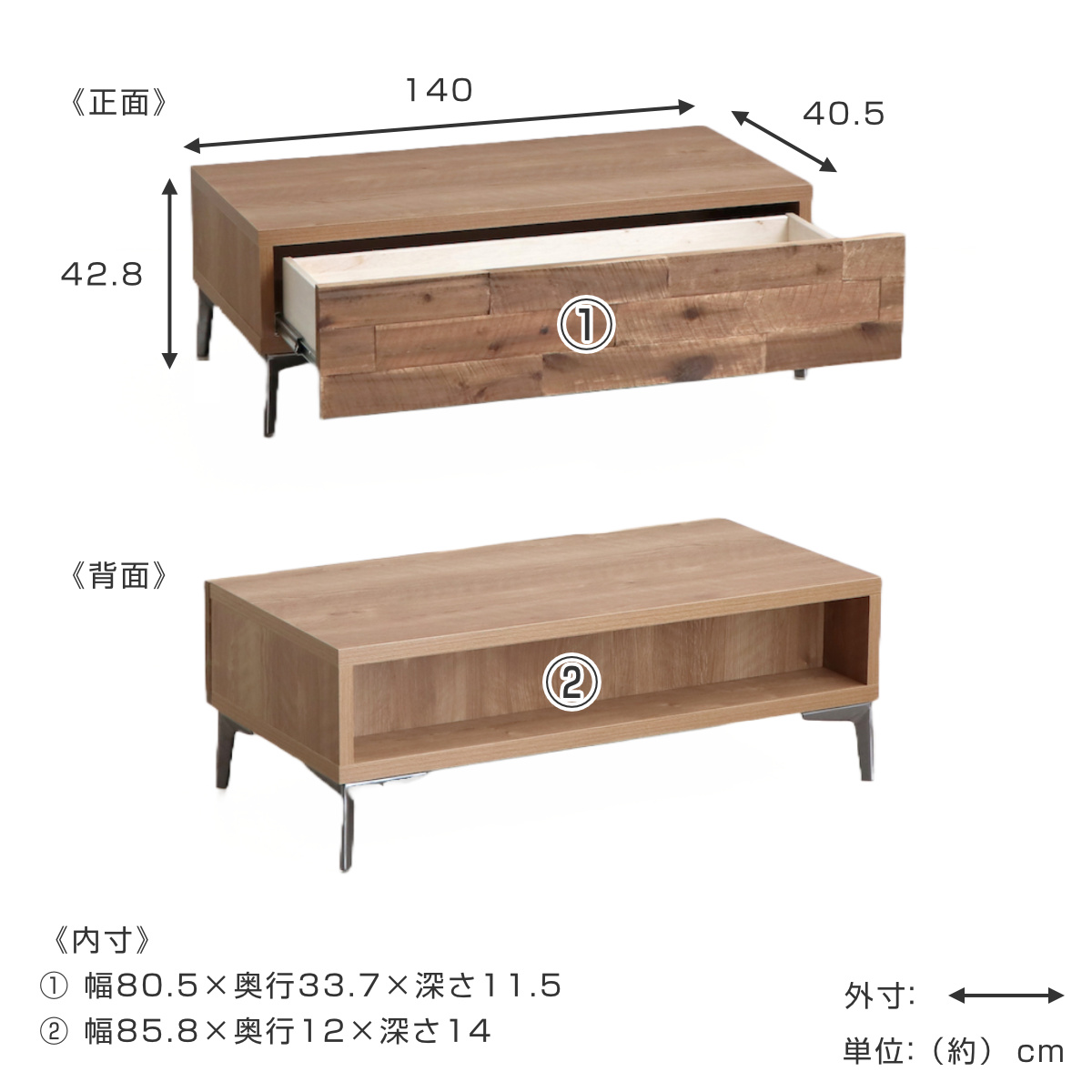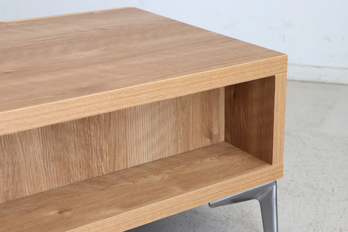 | 材質 | 天板:強化紙化粧板 本体:プリント化粧板 前板(塗装):凹凸アカシア無垢(オイル塗装) 脚部:スチール(クリア塗装)高さ130mm 裏面化粧あり |