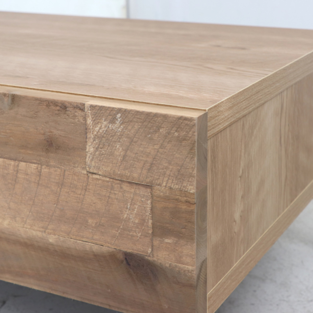 前面の無垢材はランダムな凹凸のデザインになっております。木目の表面にオイル塗装をすることで木目がはっきり浮かび上がり、木本来の色をそのまま楽しむことができます。