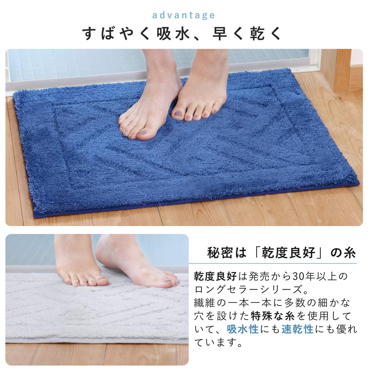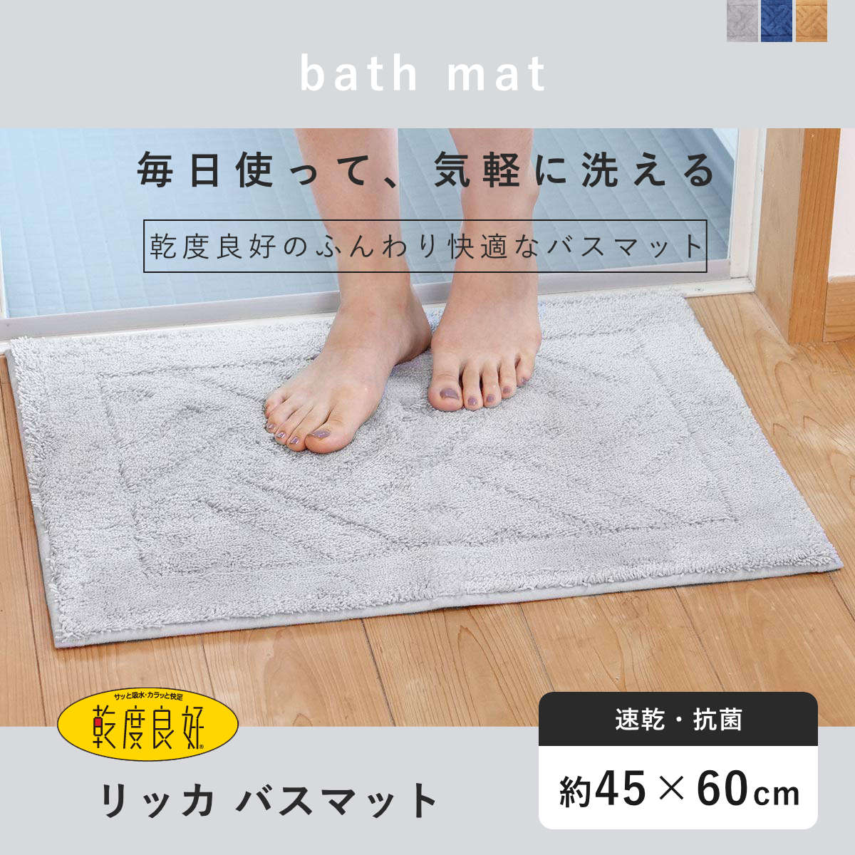足元サラサラがずっと続く、抗菌加工の乾度良好バスマット