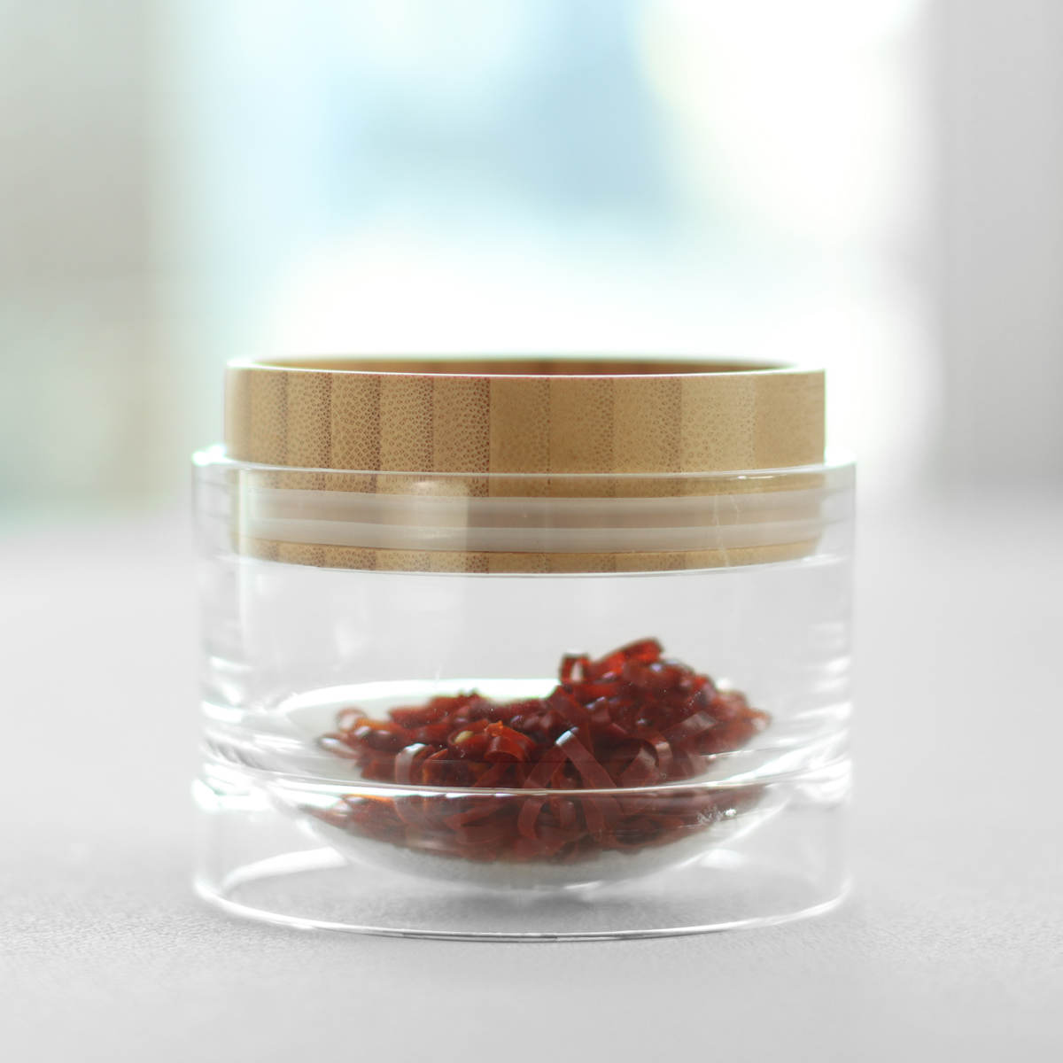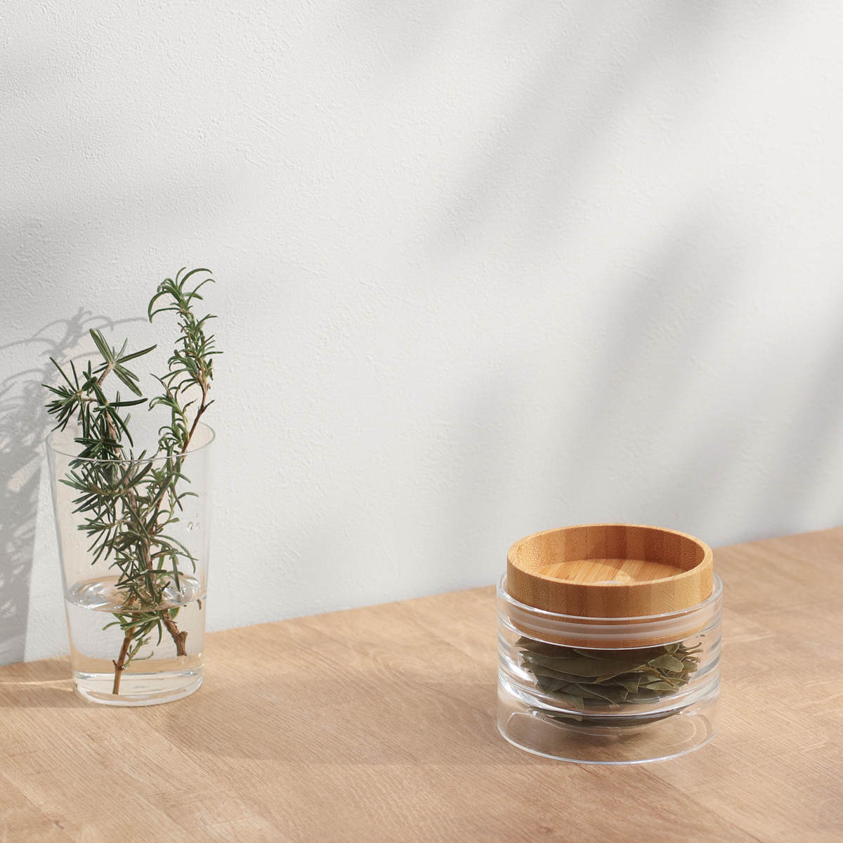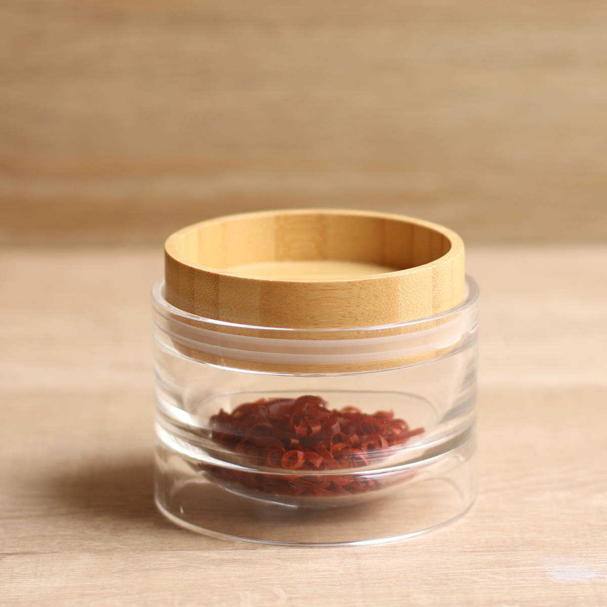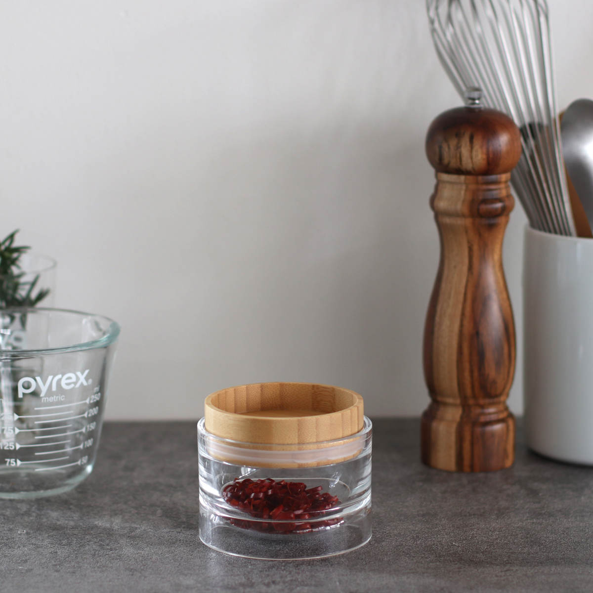 容量は150mlと小さめサイズ。キッチンでスパイスやハーブなどの保存はもちろん、クリップなどの文房具、ボタンなど小物を入れる容器として使うのもおすすめです。150mlを2個重ねると、450mlと650mlと高さが揃います。150mlと250mlを重ねると850mlと高さが揃います。