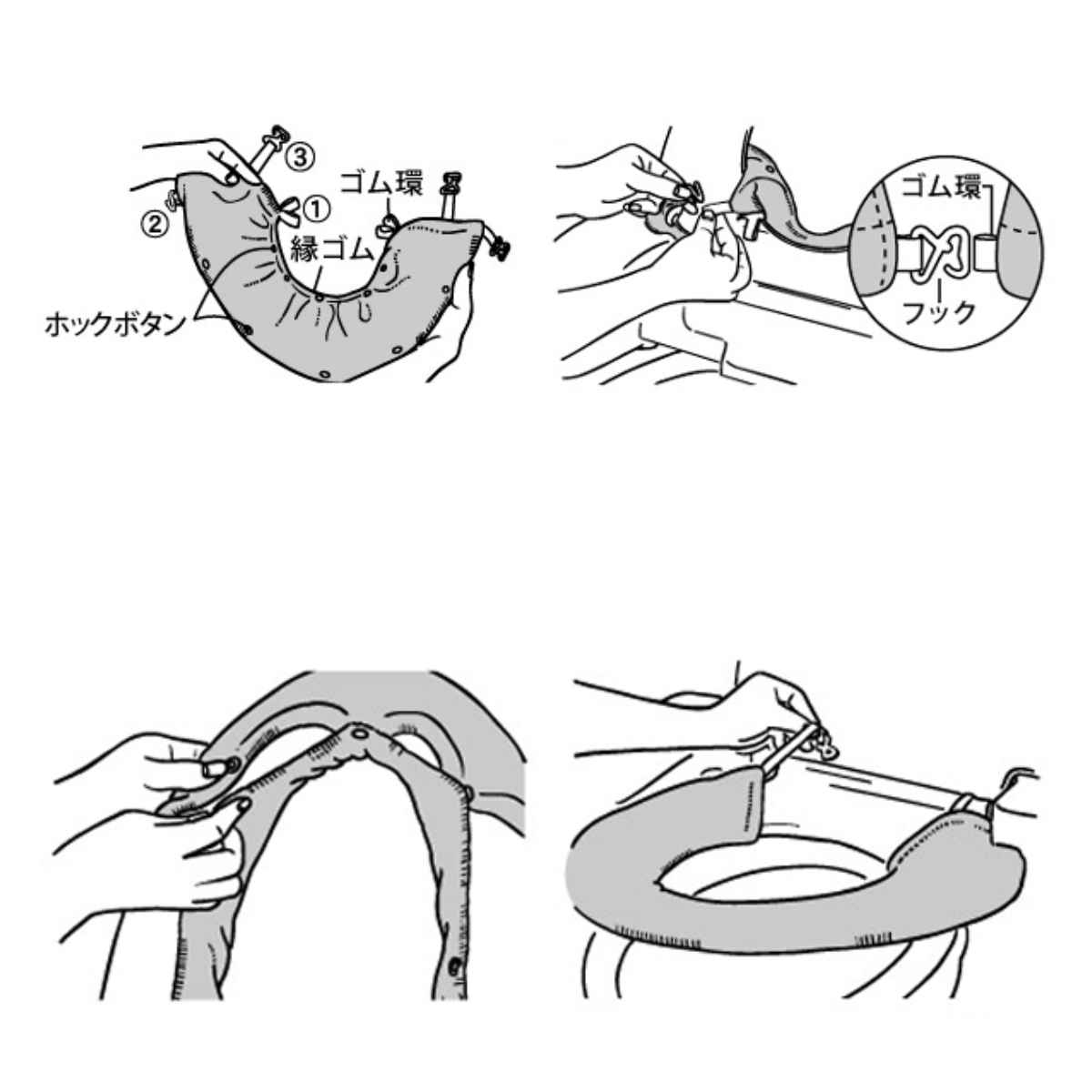便座全体にカバーをかぶせ、裏面中央部よりホックを止めてください。
