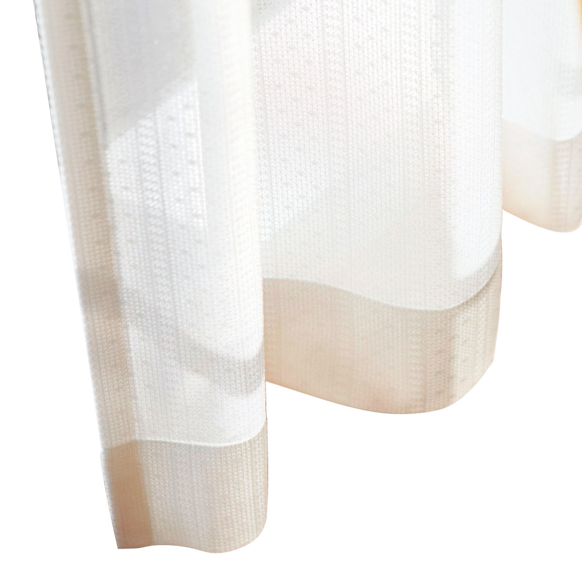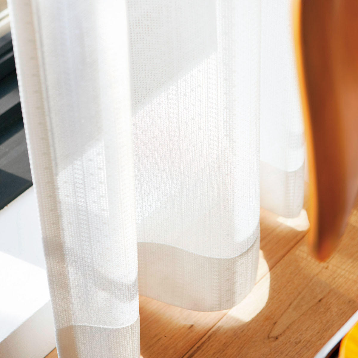 ドットとストライプ模様がさりげなくあしらわれたデザインです。お部屋に馴染むシンプルな配色で、どんなドレープカーテンにも合わせていただけます。北欧風インテリアやナチュラルテイストのお部屋にはもちろん、カラフルなインテリアに合わせるのにも最適です。