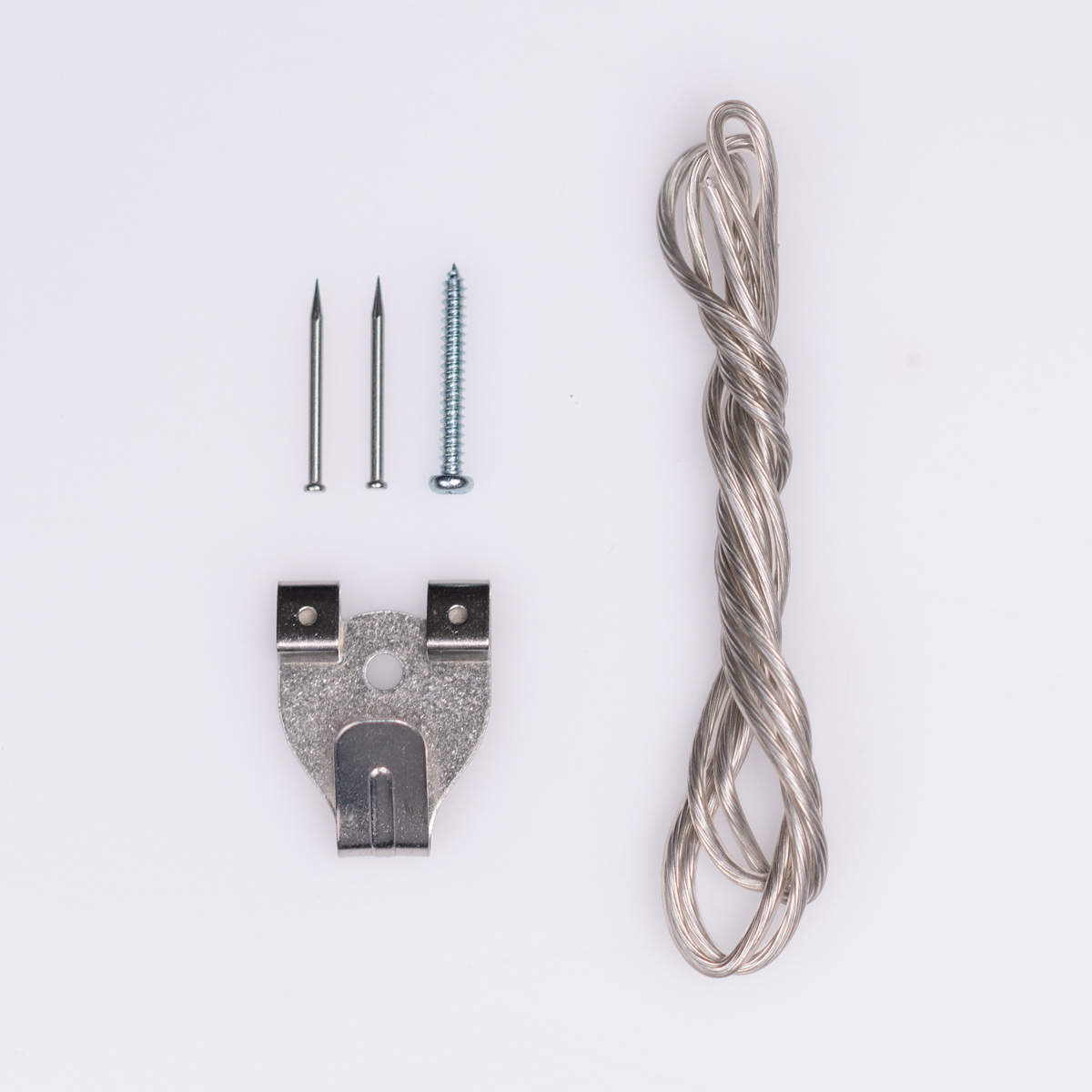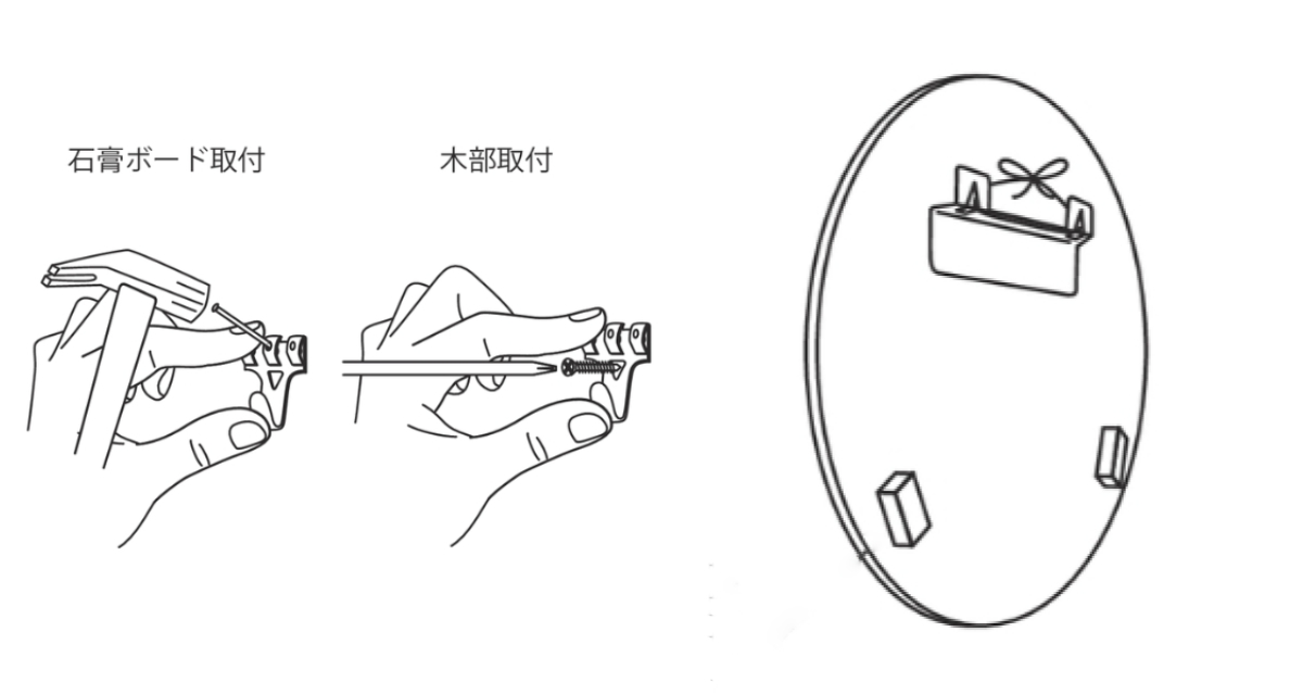 フック、石膏ボード取付用ピン2本(ミラーの種類により付属する部品が多少異なります)、木部取付ネジ1本、ワイヤーが付属しています。